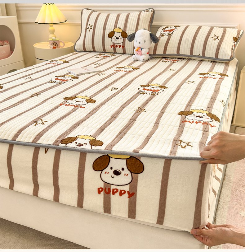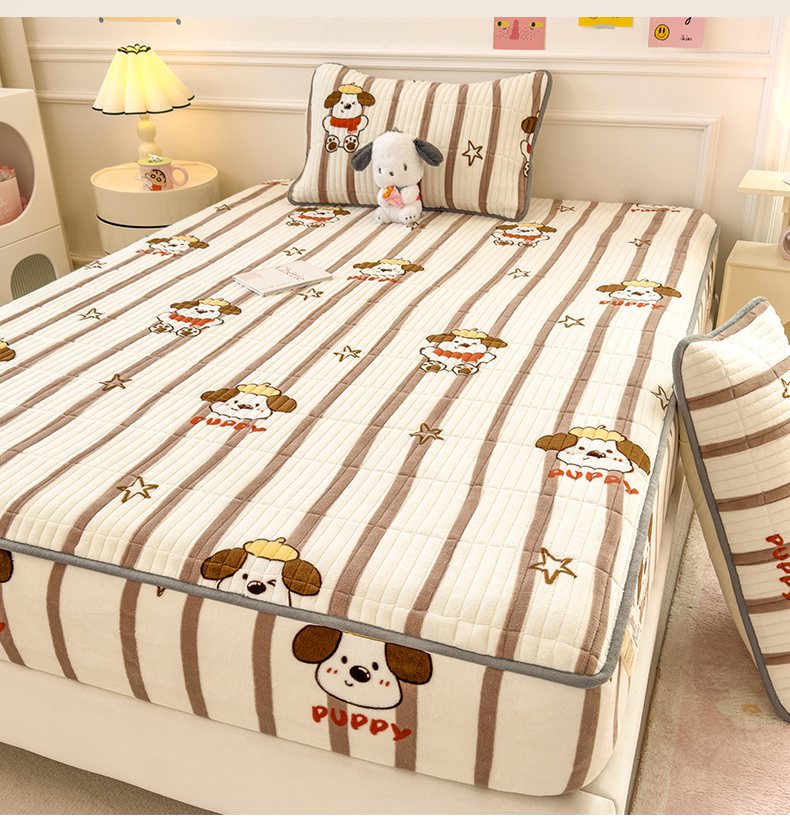 摩妮卡 2025新款小清新系列印花牛奶绒夹棉床笠三件套 嘟嘟狗