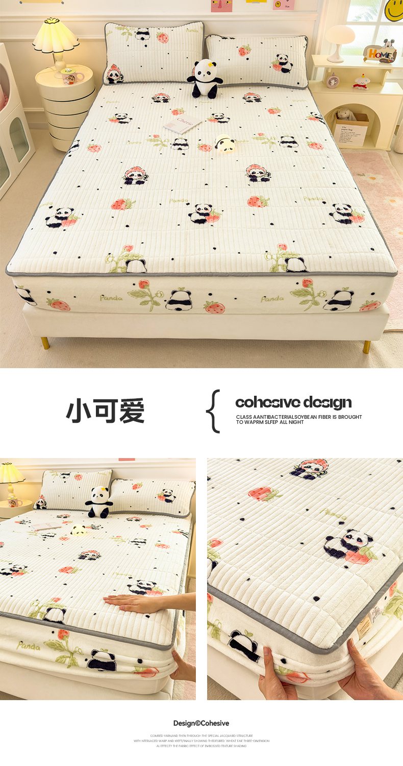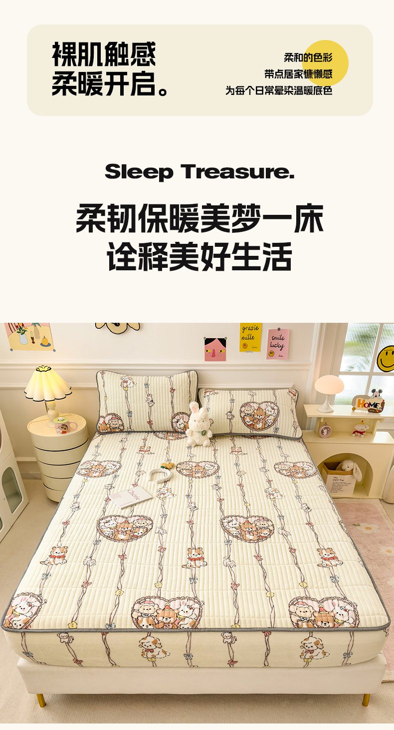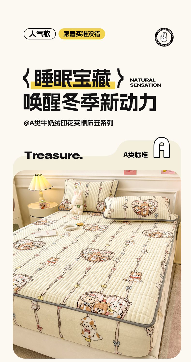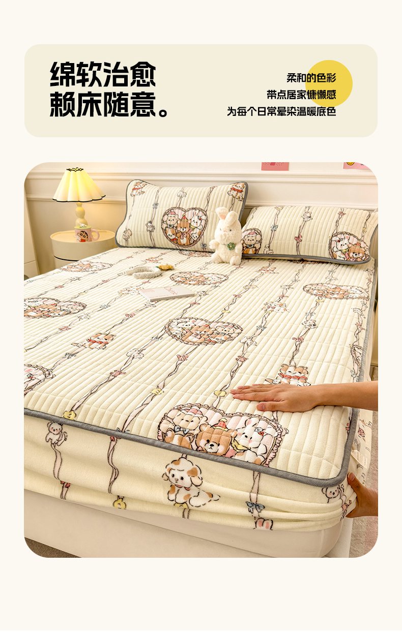 • 91家纺网 家纺一手货源 找家纺 摩妮卡 2025新款小清新系列印花牛奶绒夹棉床笠三件套 童趣乐园