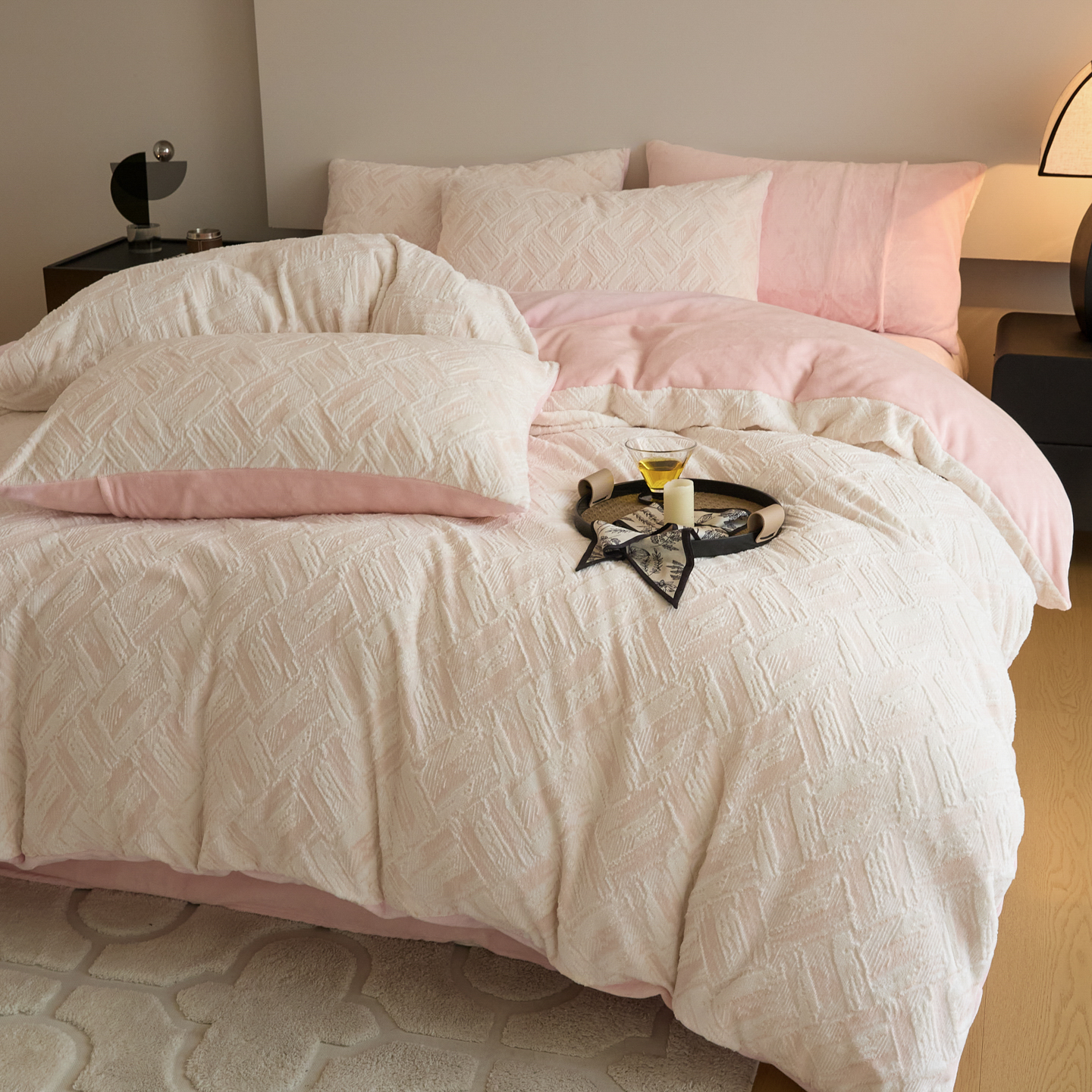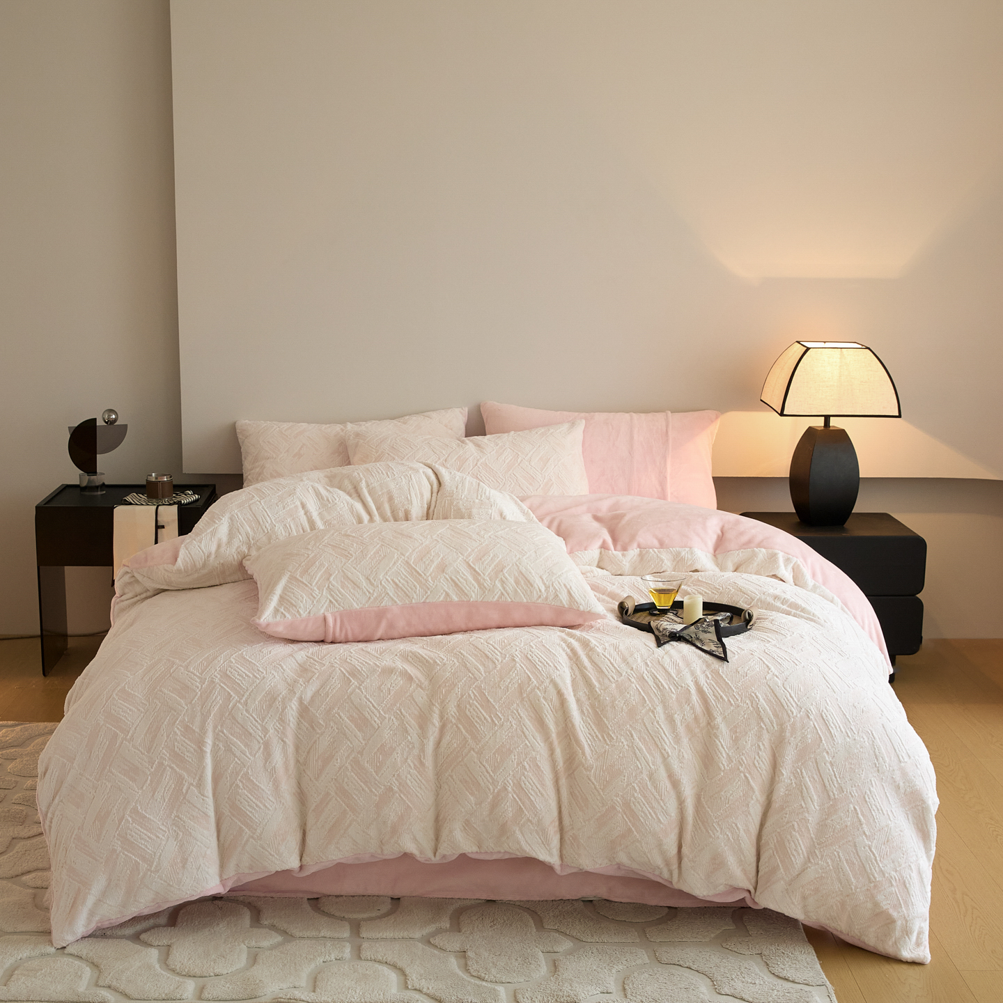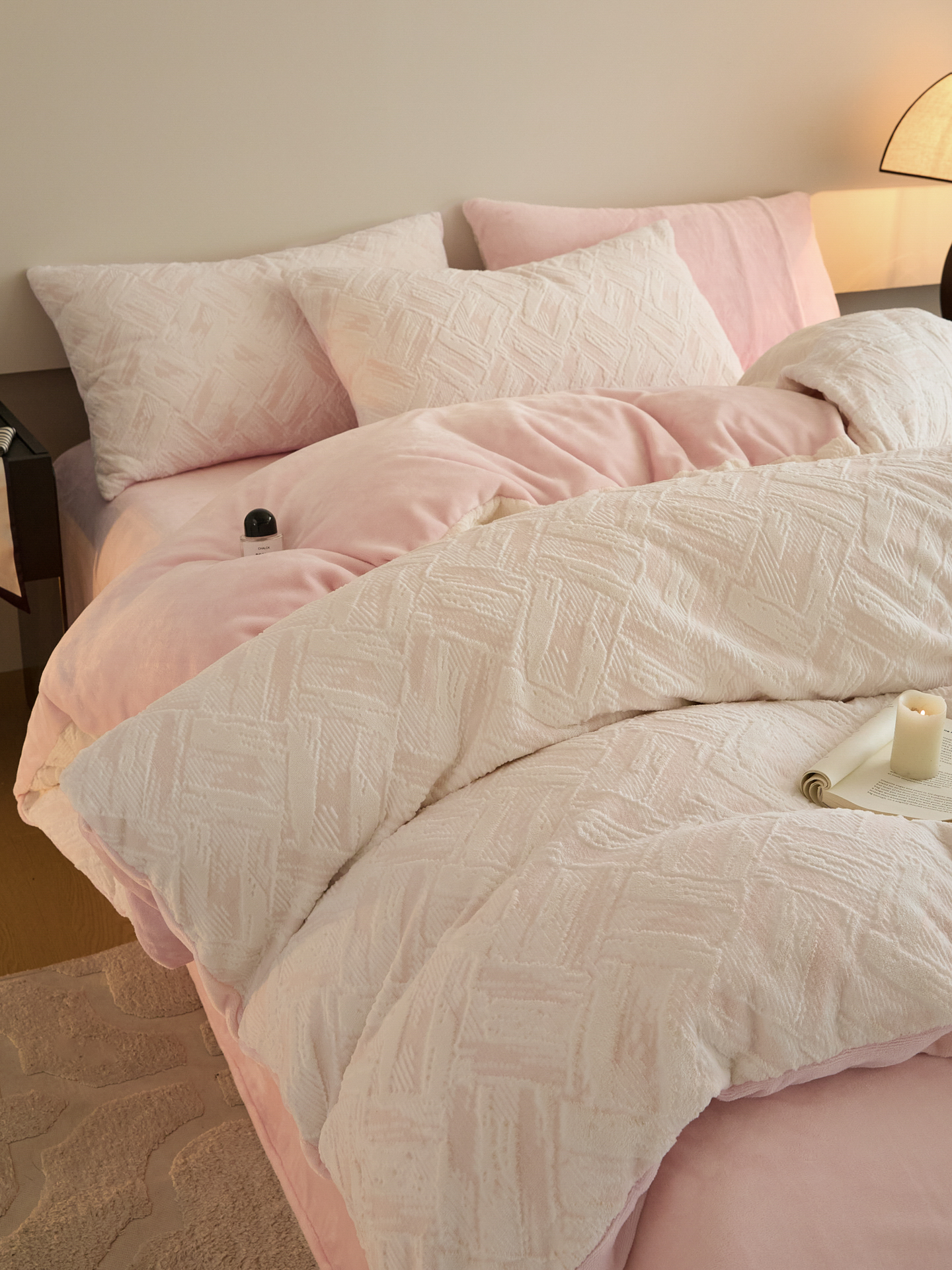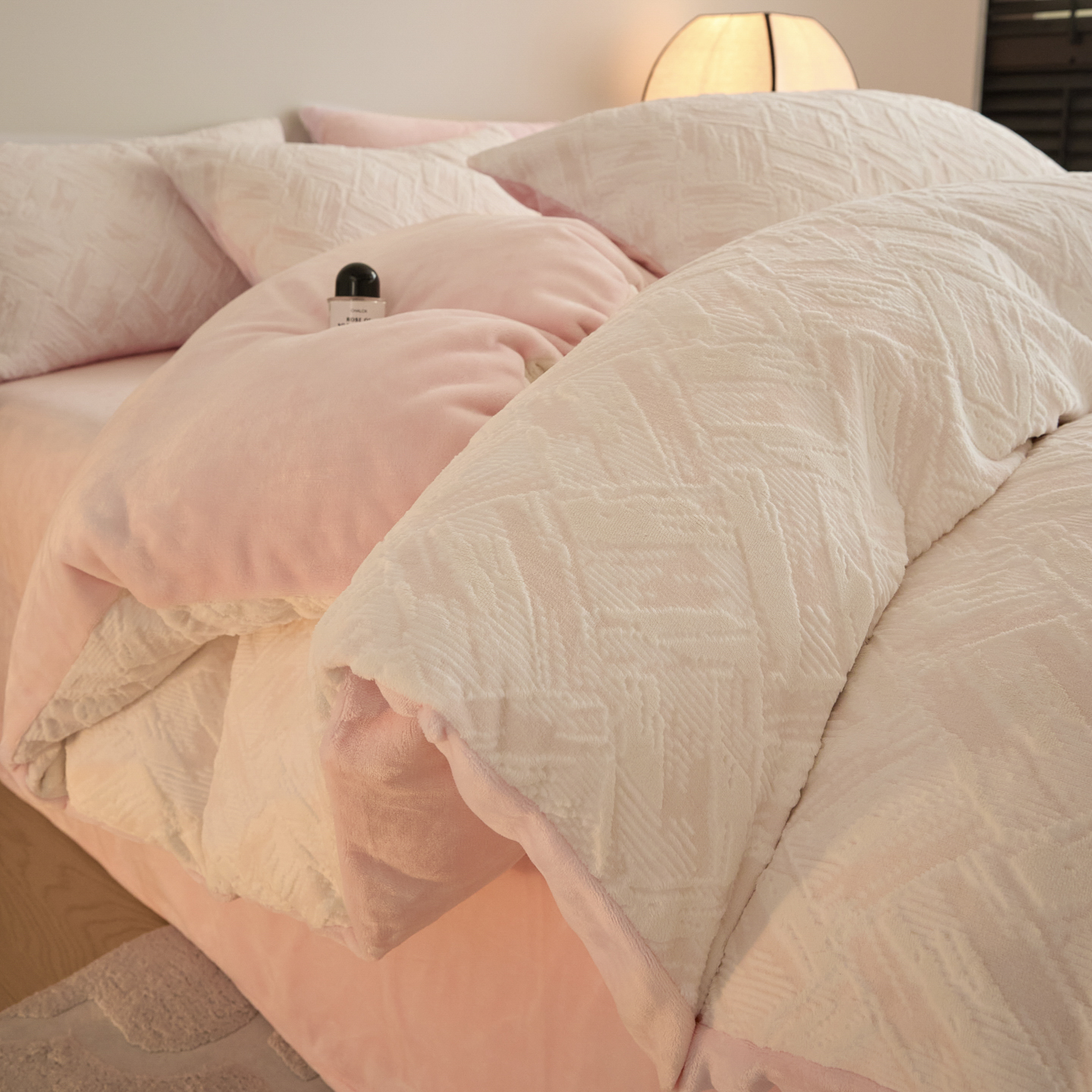 当前位置: 91家纺网 > 商品网购 > 床品套件 > 四件套 > 牛奶绒四件套 > 言一 2025新款A类全消光超柔260G保暖加厚立体雕花牛奶绒四件套 霜语-粉