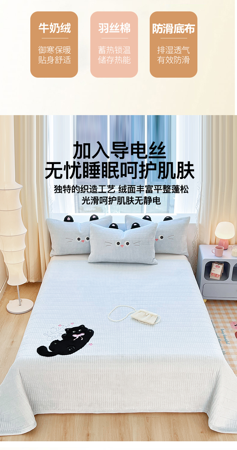 • 91家纺网 家纺一手货源 找家纺 曼町家居 2025新款秋冬加厚牛奶绒防滑单床盖系列 尤米-天空蓝