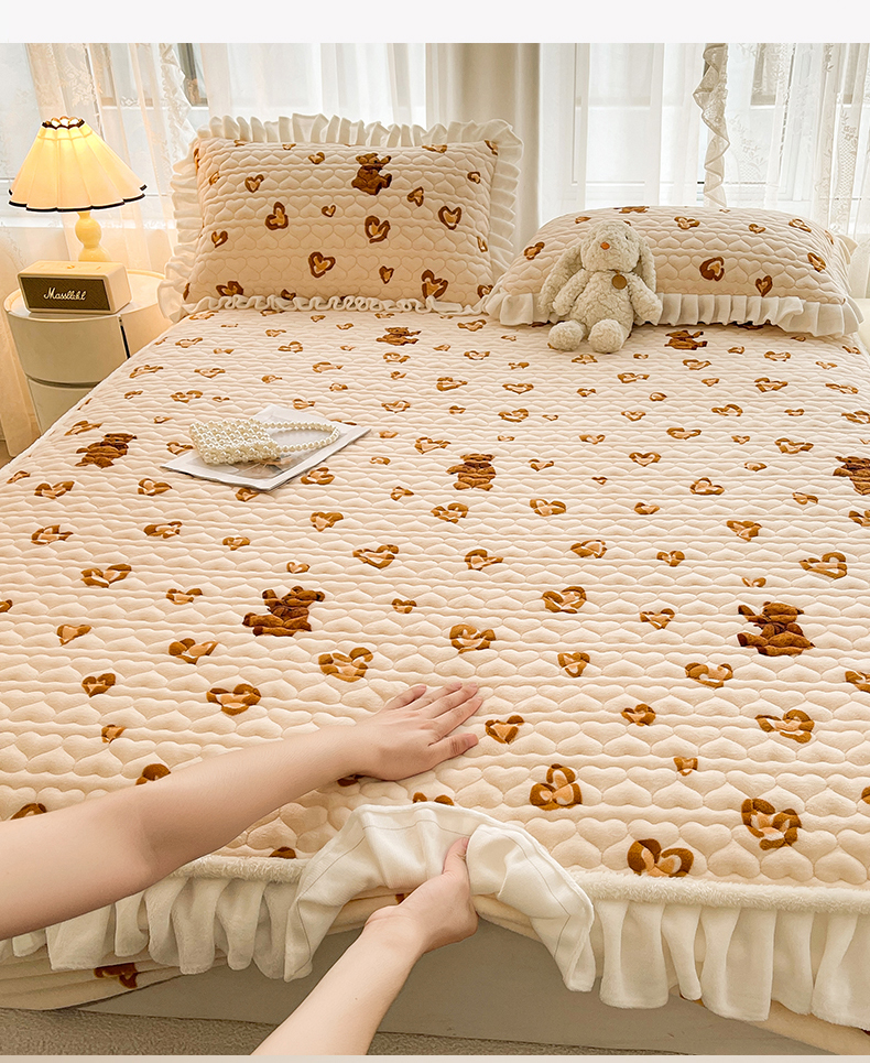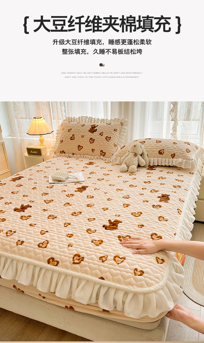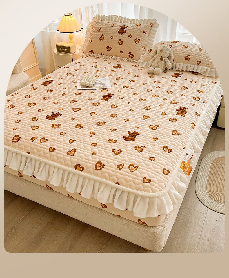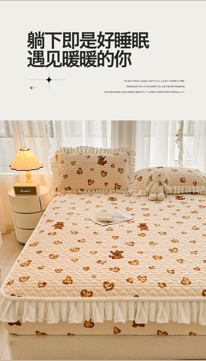 雯豆家纺 2025新款牛奶绒花边床笠单床笠单品床笠单件床笠 牛奶绒花边床笠-亲子熊