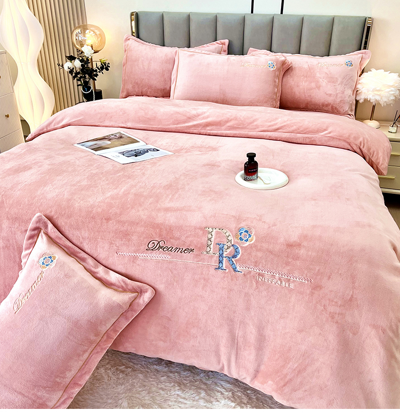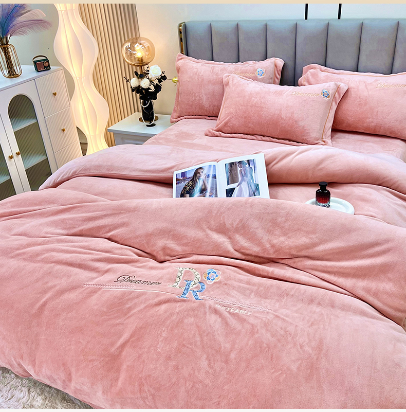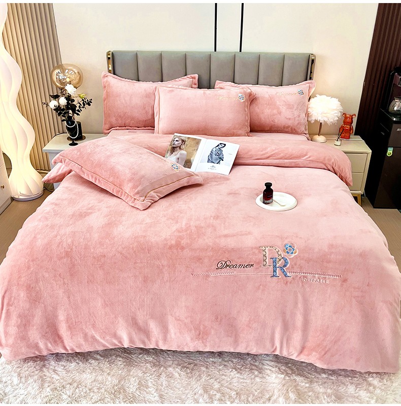 鑫利来家纺 2025新款牛奶绒四件套绣花加厚牛奶绒保暖四件套 可可-粉玉