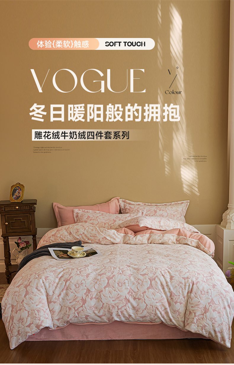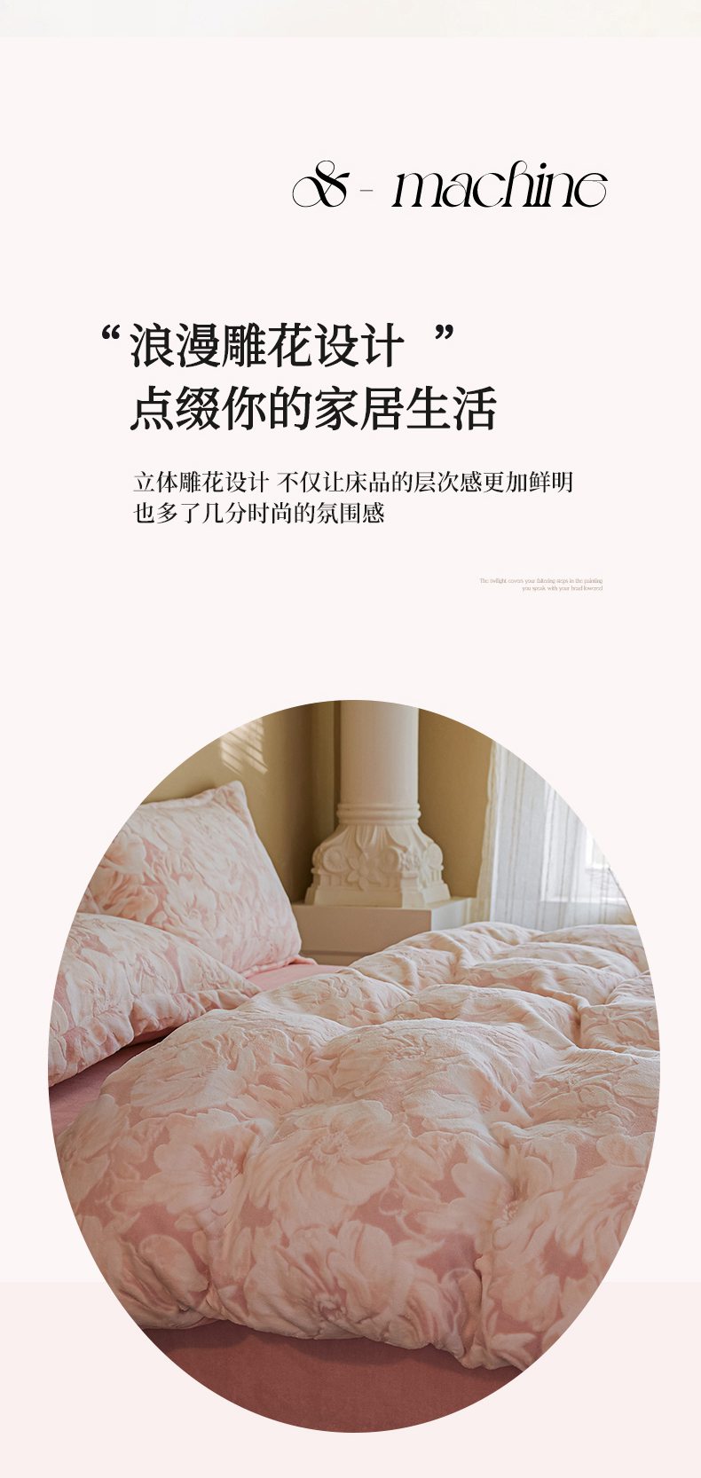 当前位置: 91家纺网 > 商品网购 > 床品套件 > 四件套 > 牛奶绒四件套 > 菡宝 【主推第三批 带质检报告】A类全消光230g雕花绒牛奶绒四件套支持定制定做尺寸 繁花倾心