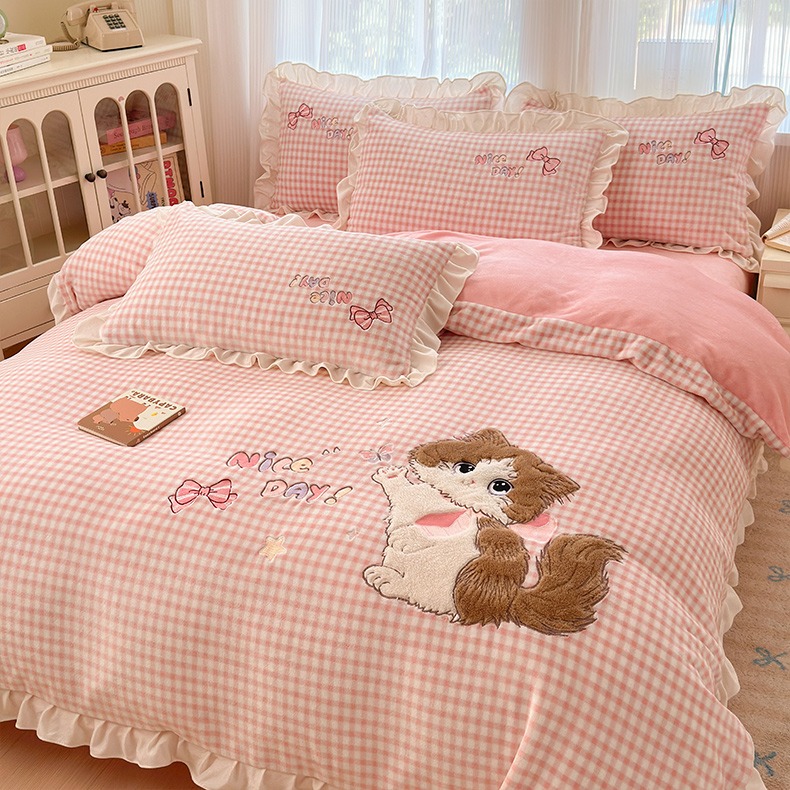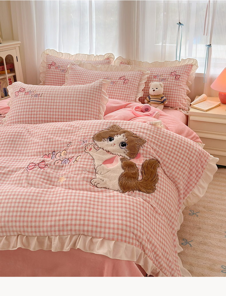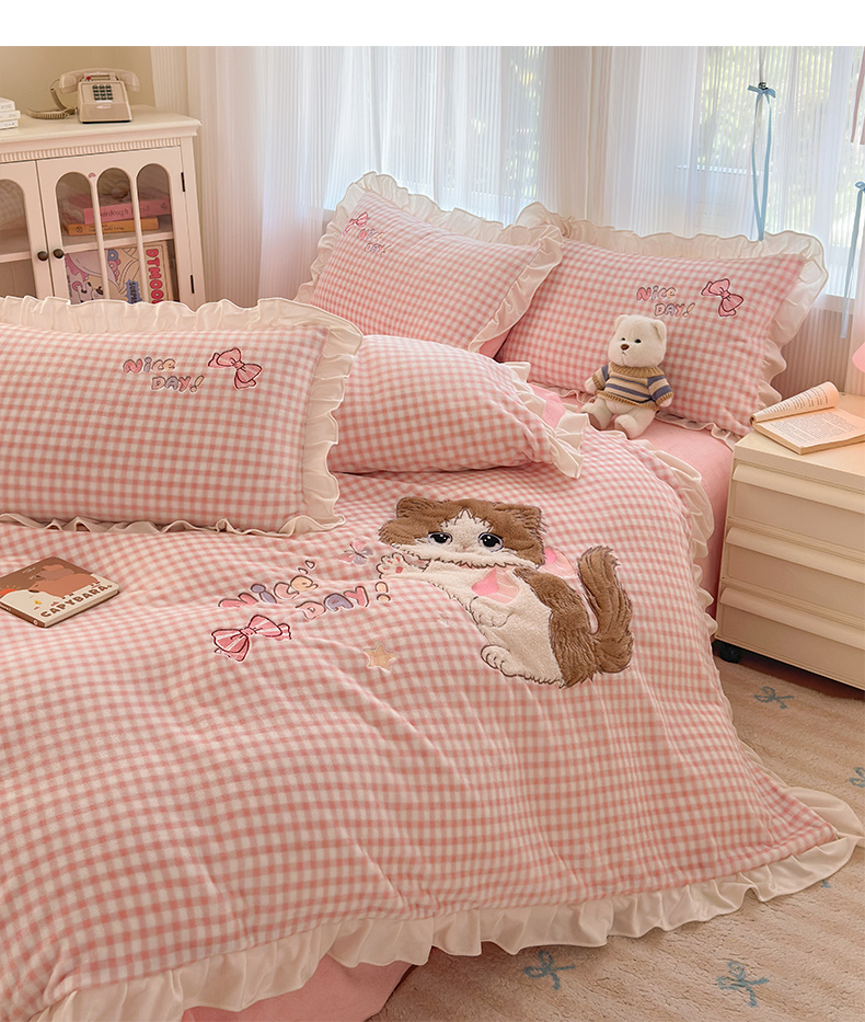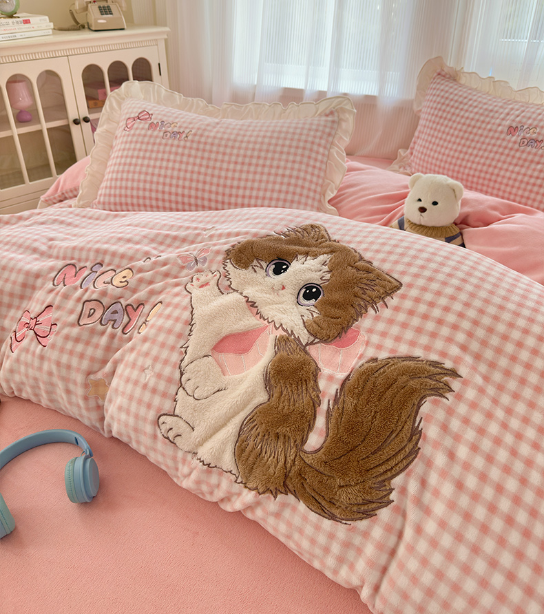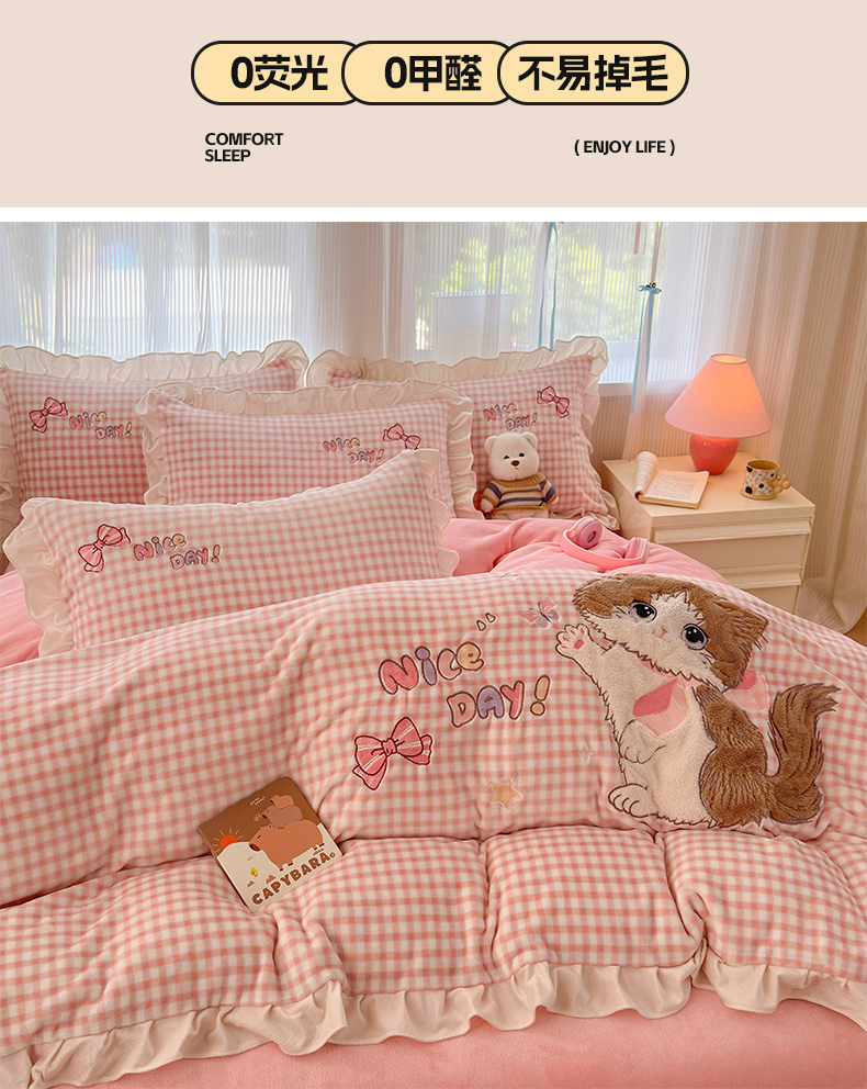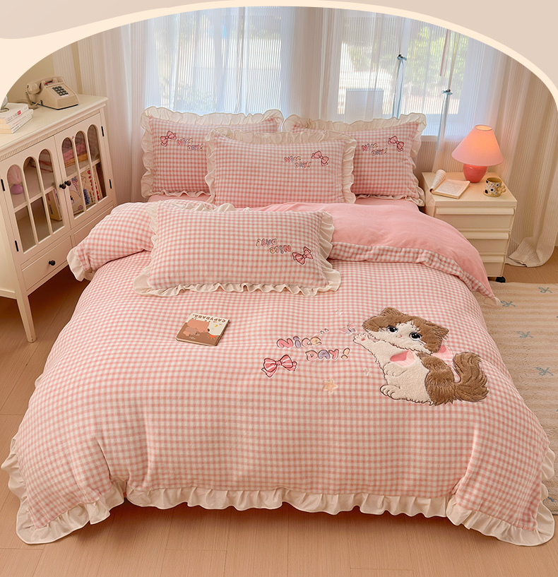 当前位置: 91家纺网 > 商品网购 > 床品套件 > 四件套 > 牛奶绒四件套 > 易禾 2025新款韩版牛奶绒卡通兔毛贴布刺绣床单款床笠款四件套三件套小奶猫系列(专版) 小奶猫——粉格