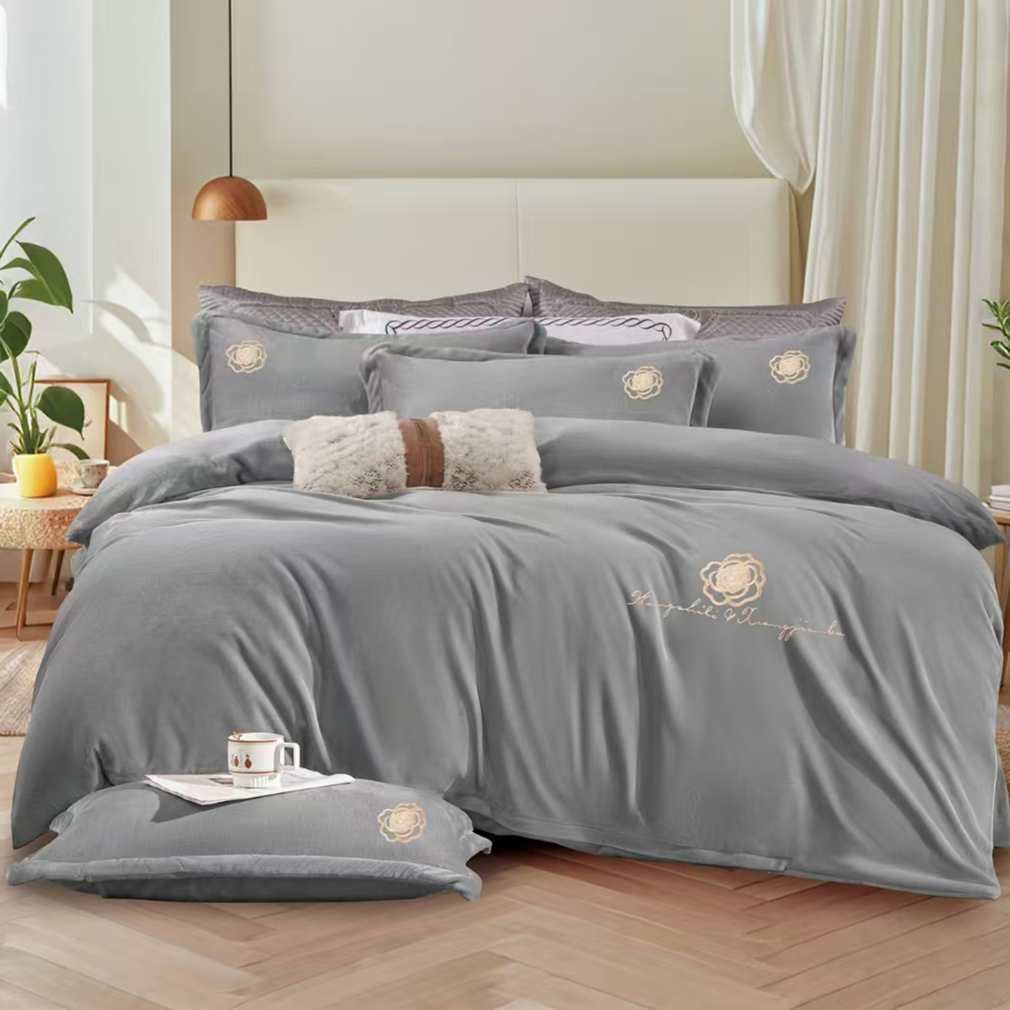 小叮当家纺仓储工厂店 2025新款亲肤舒适加厚刺绣款牛奶绒四件套 灰色