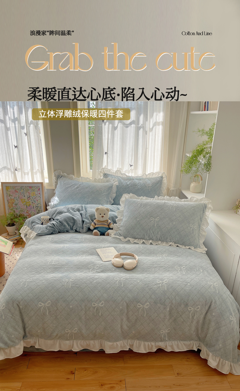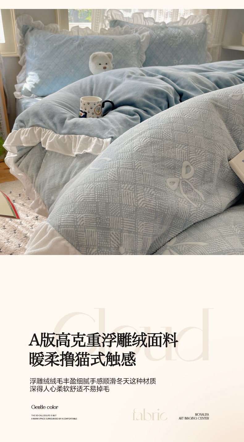 (总)三朵家纺 2025新款3D立体加厚雕花绒牛奶绒花边款四件套,花边宽条-灰色,花边宽条-蓝色,花边宽条-玉色,花边宽条-紫