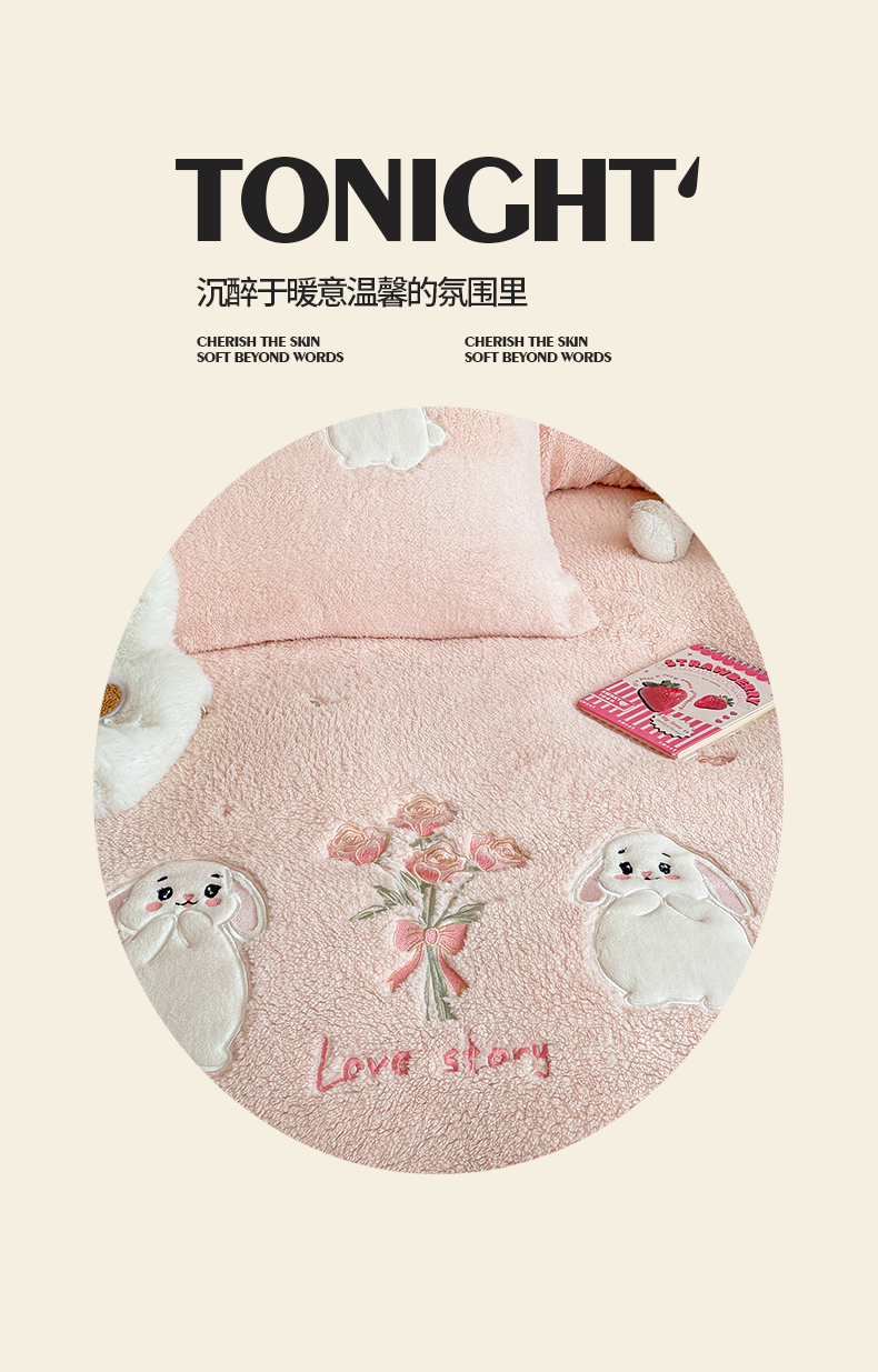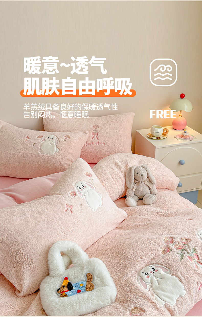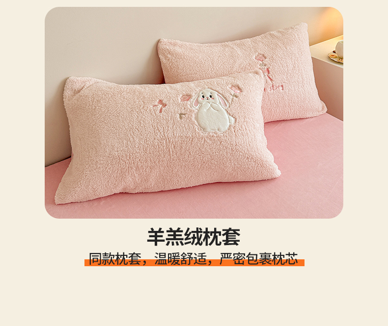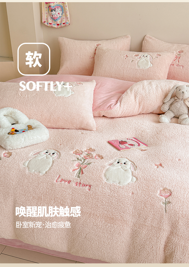 当前位置: 91家纺网 > 商品网购 > 床品套件 > 四件套 > 其它四件套 > 典曼家纺 2025新款A类羊羔绒刺绣四件套系列 捧花小兔