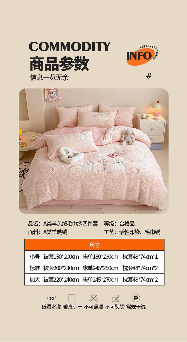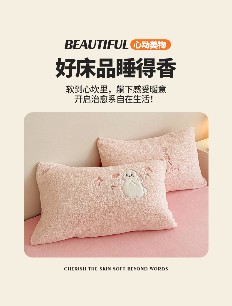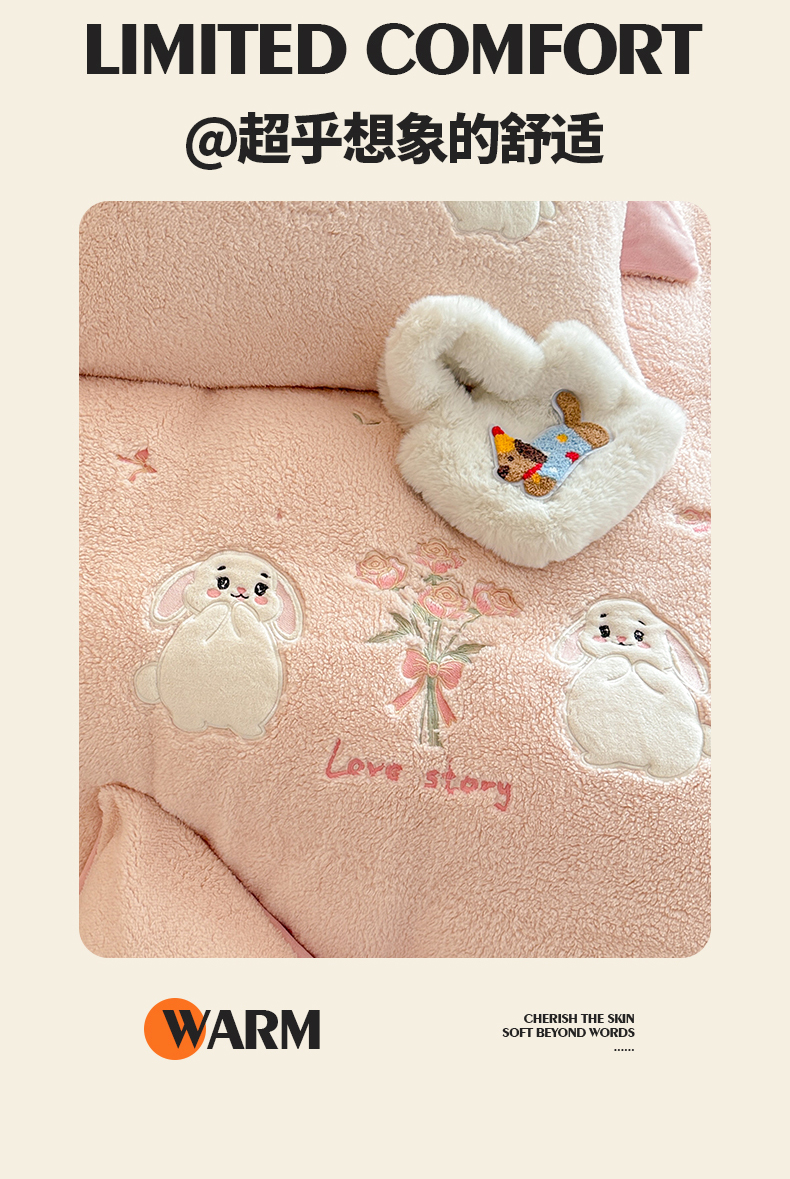 当前位置: 91家纺网 > 商品网购 > 床品套件 > 四件套 > 其它四件套 > 典曼家纺 2025新款A类羊羔绒刺绣四件套系列 捧花小兔