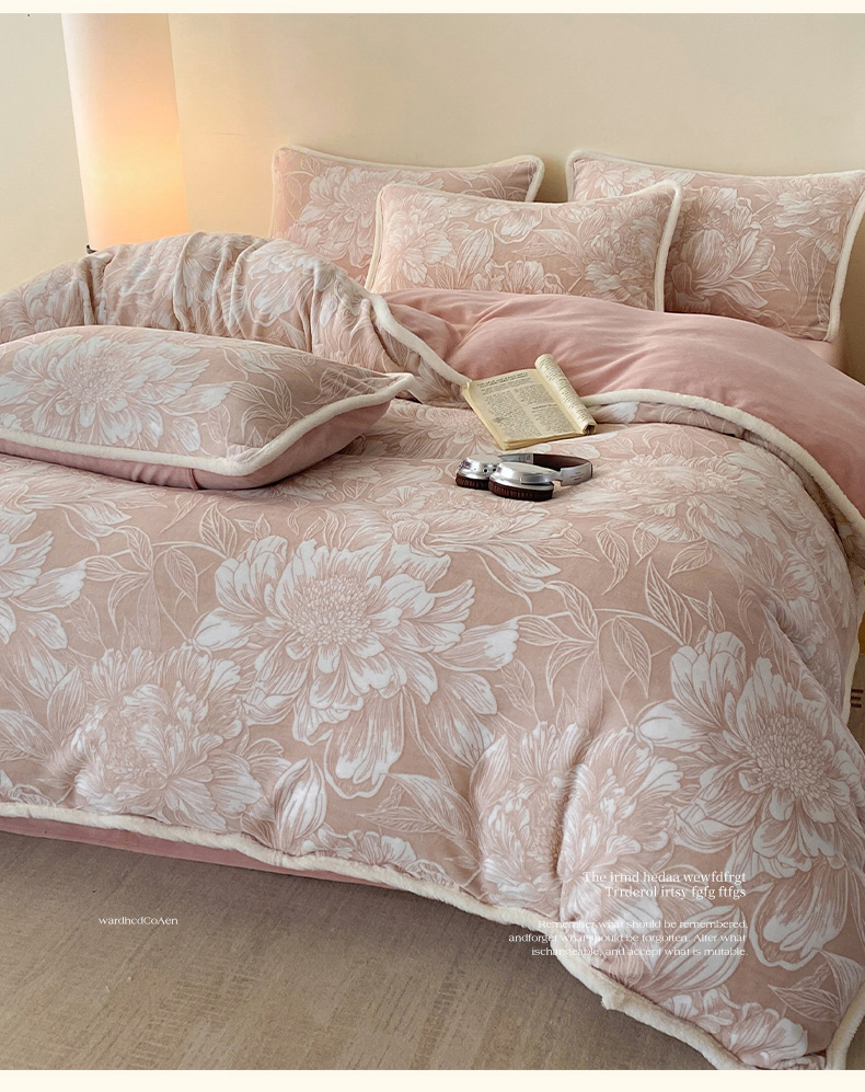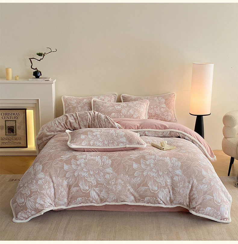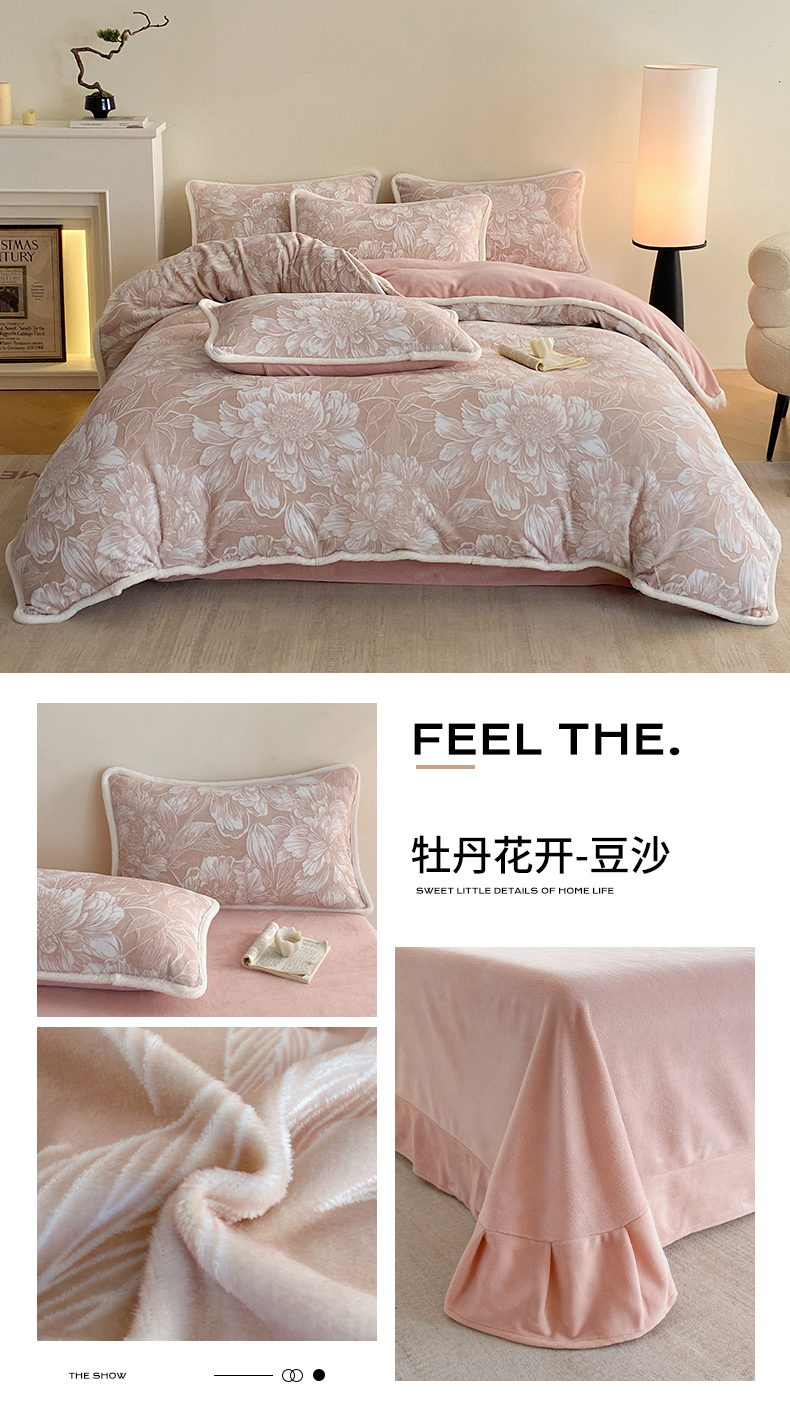 商品名称:绘萱家居 2025新款爆款高密消光包边雕花牛奶绒四件套立体5D 牡丹花开-豆沙