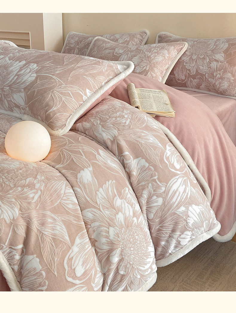 绘萱家居 2025新款爆款高密消光包边雕花牛奶绒四件套立体5D 牡丹花开-豆沙
