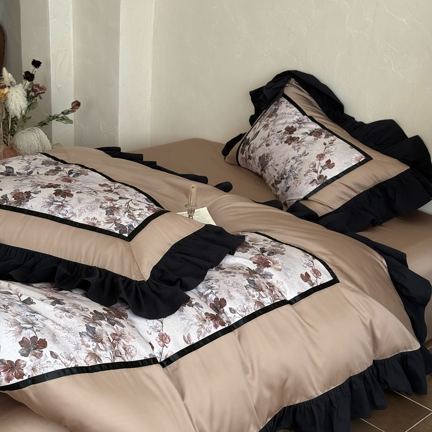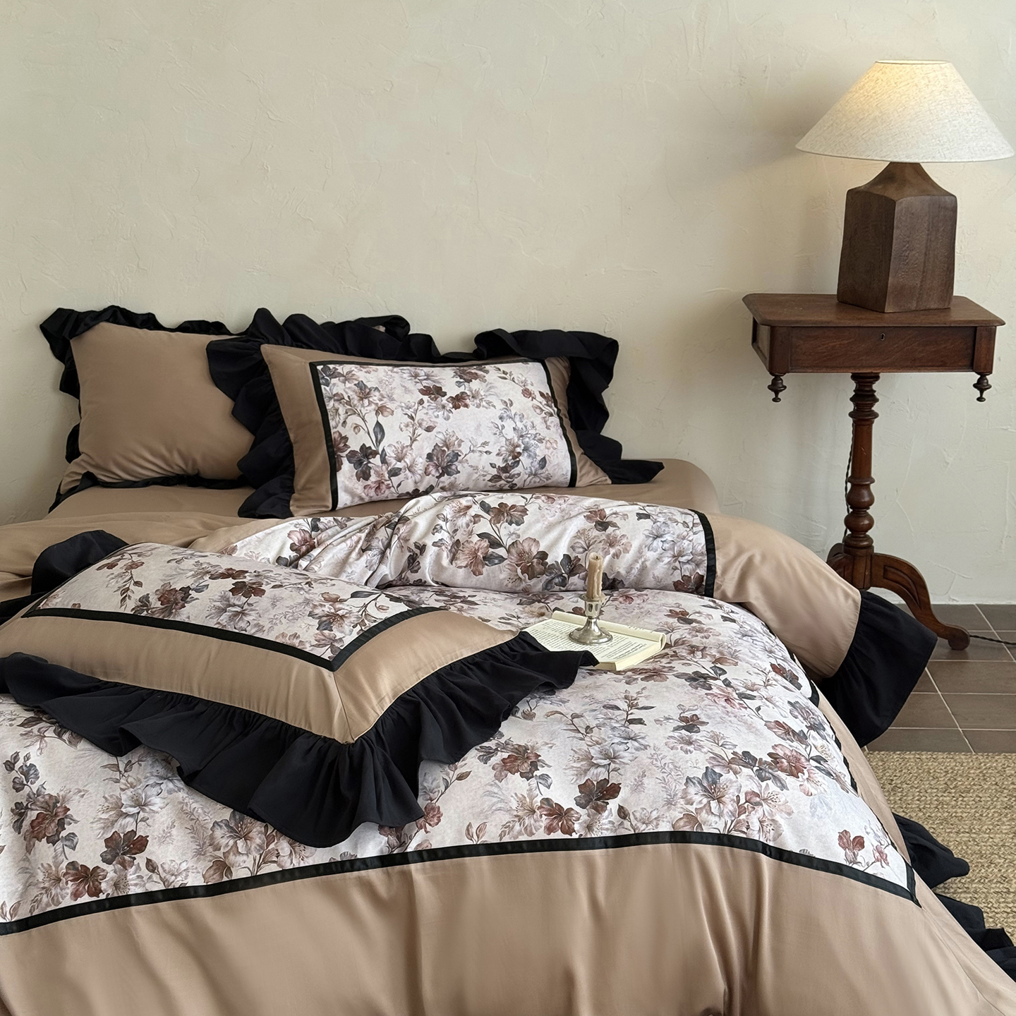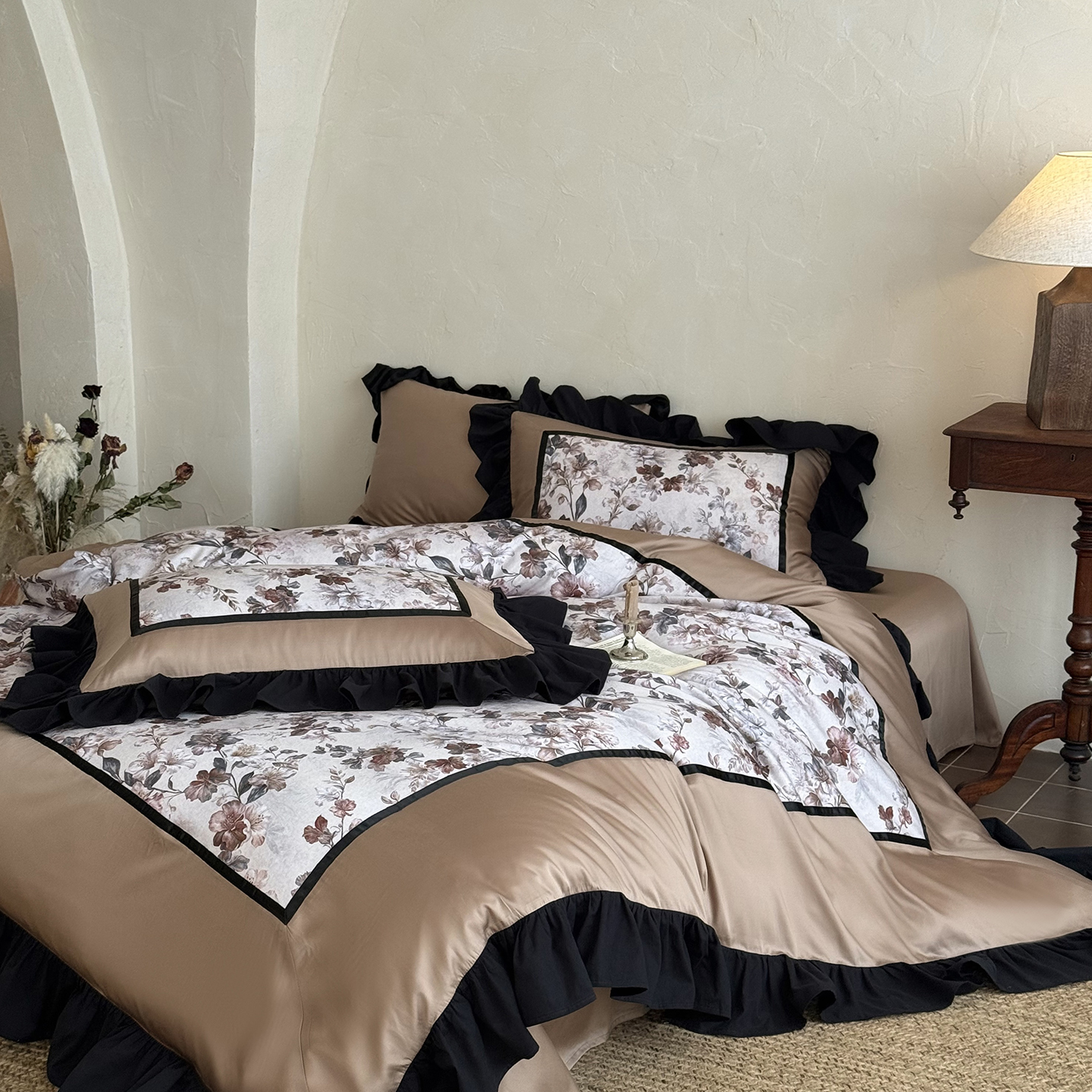 (总)佳汐蓝 2025春夏新品双层皱皱纱刺绣+织带+荷叶边四件套--白茶花,奶白,曲奇
