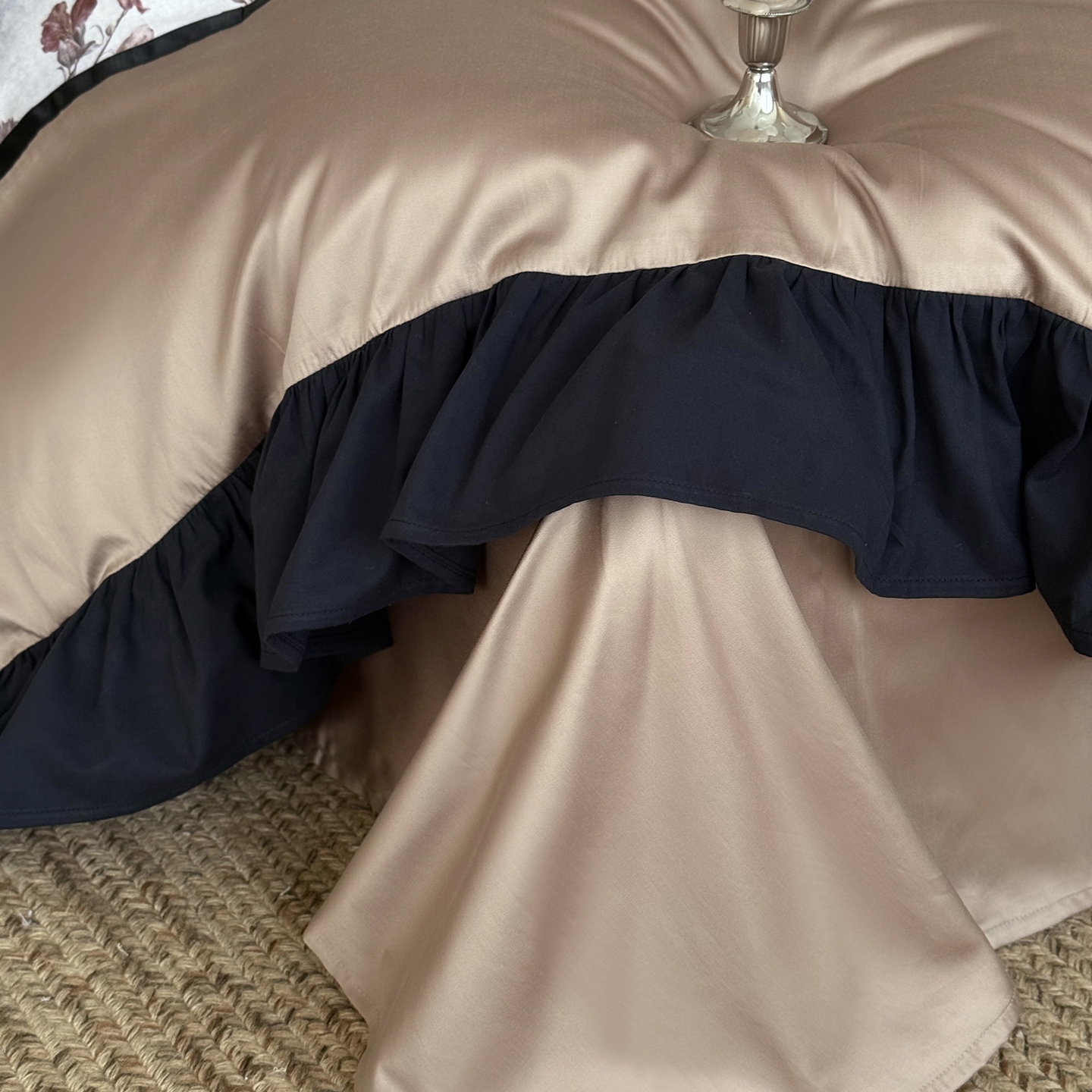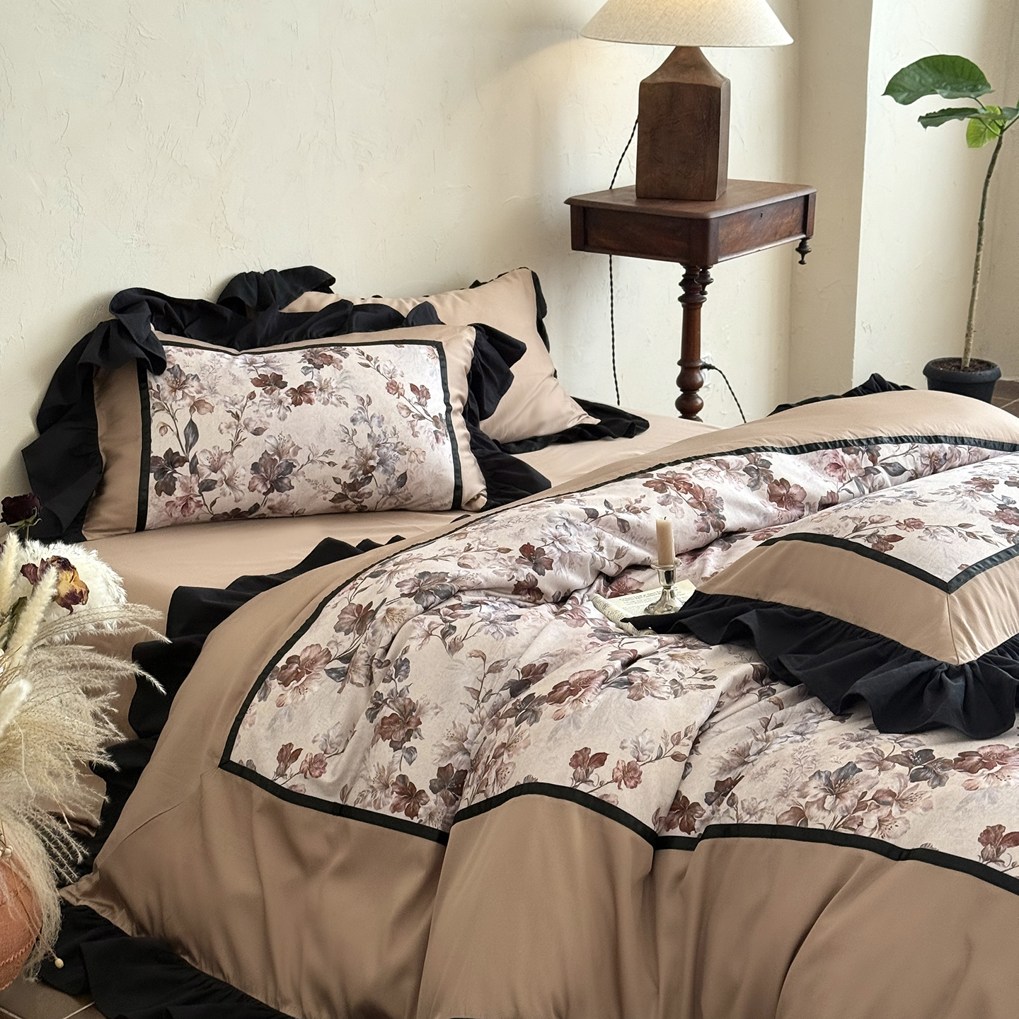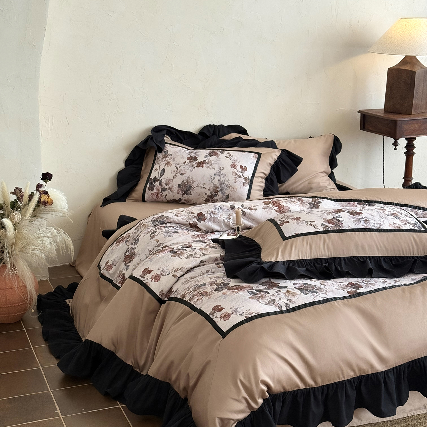 (总)佳汐蓝 2025春夏新品双层皱皱纱刺绣+织带+荷叶边四件套--白茶花,奶白,曲奇