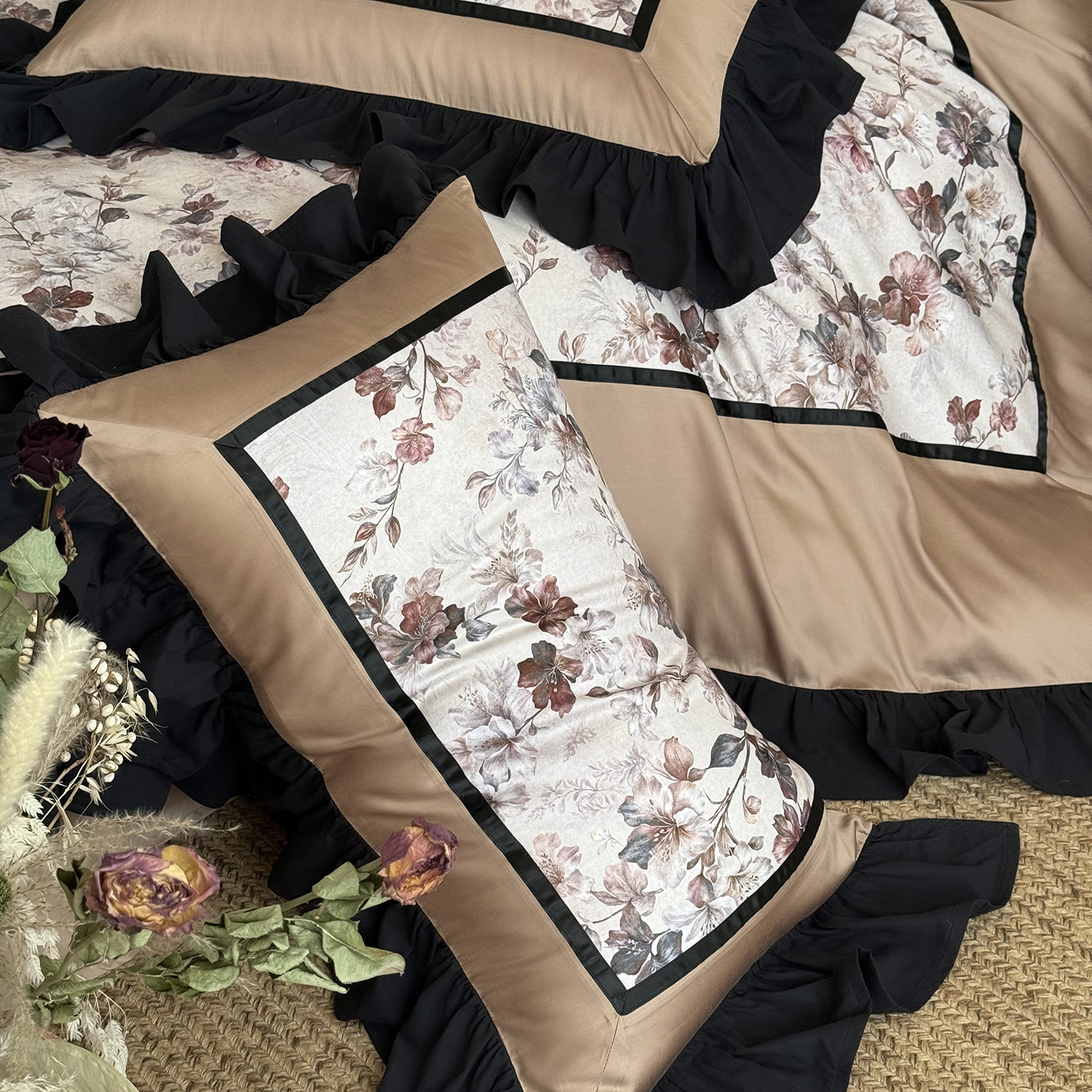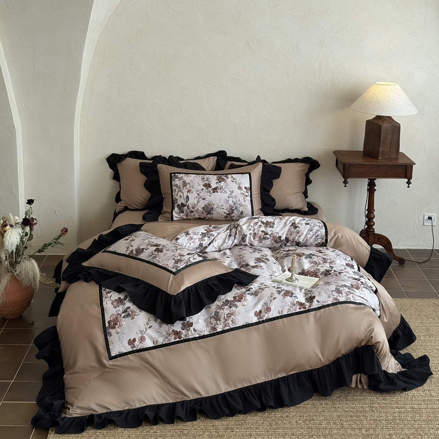 (总)佳汐蓝家纺 2026春夏新款全棉纯棉复古大提花皱皱双层纱四件套-十里蔷薇 控价:卷后不低于398,十里蔷薇-灰色,十里蔷薇-暖咖