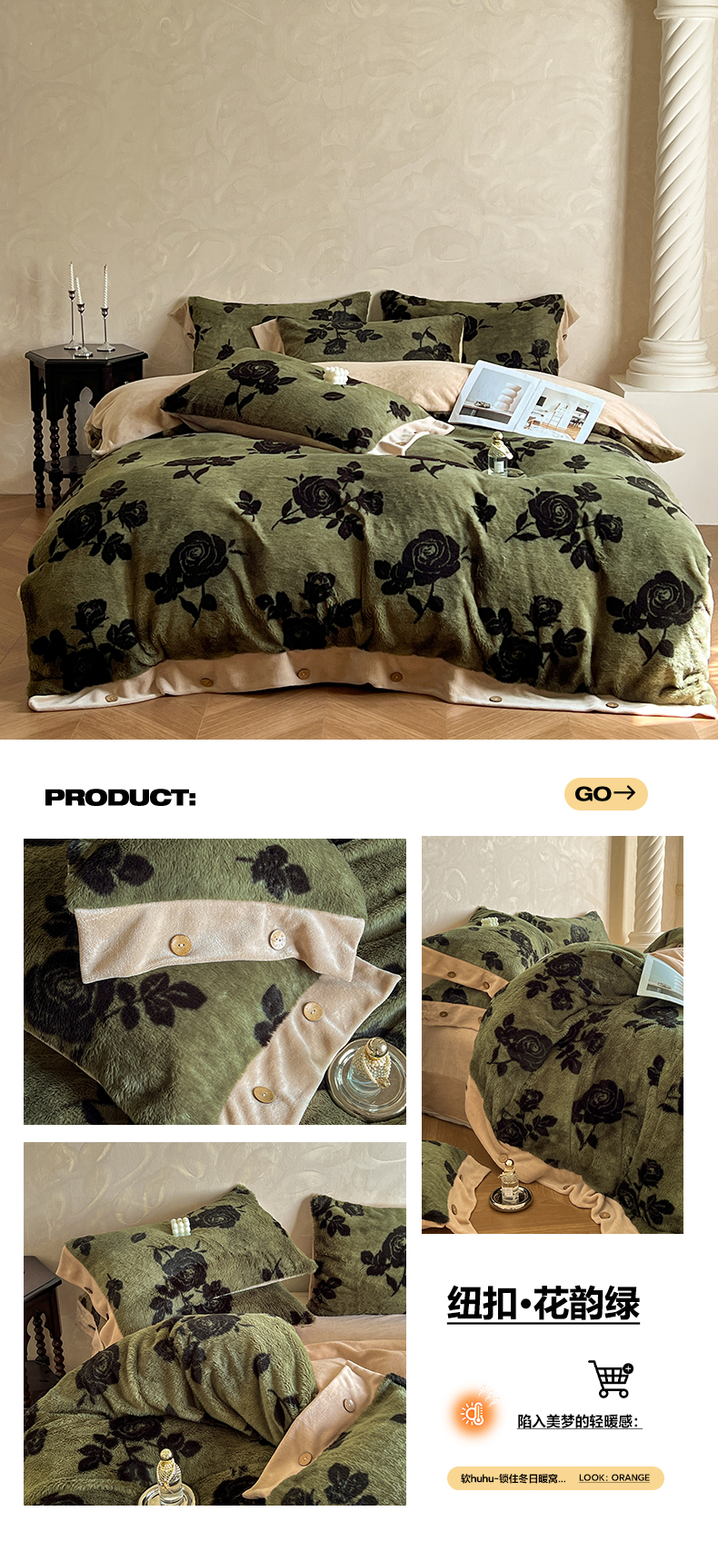 晚爱家居 2025新款纽扣款兔毛绒美拉德轻奢风高克重皮草兔绒四件套系列 纽扣-花韵绿