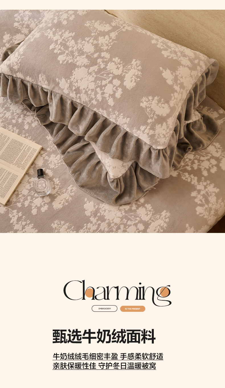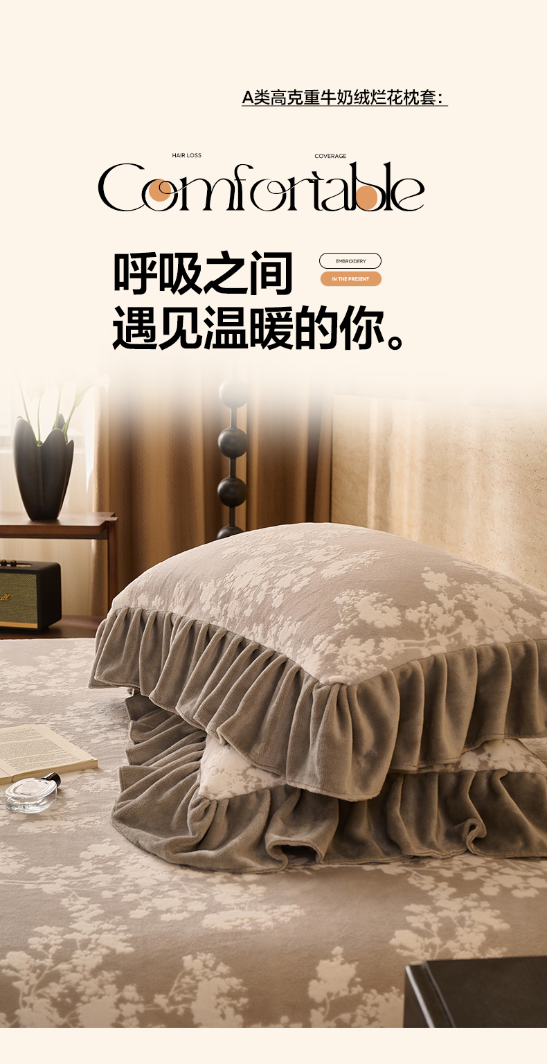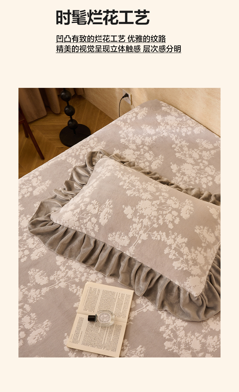 商品名称:早晨家纺 2025新款高克重牛奶绒烂花枕套 花眠灰