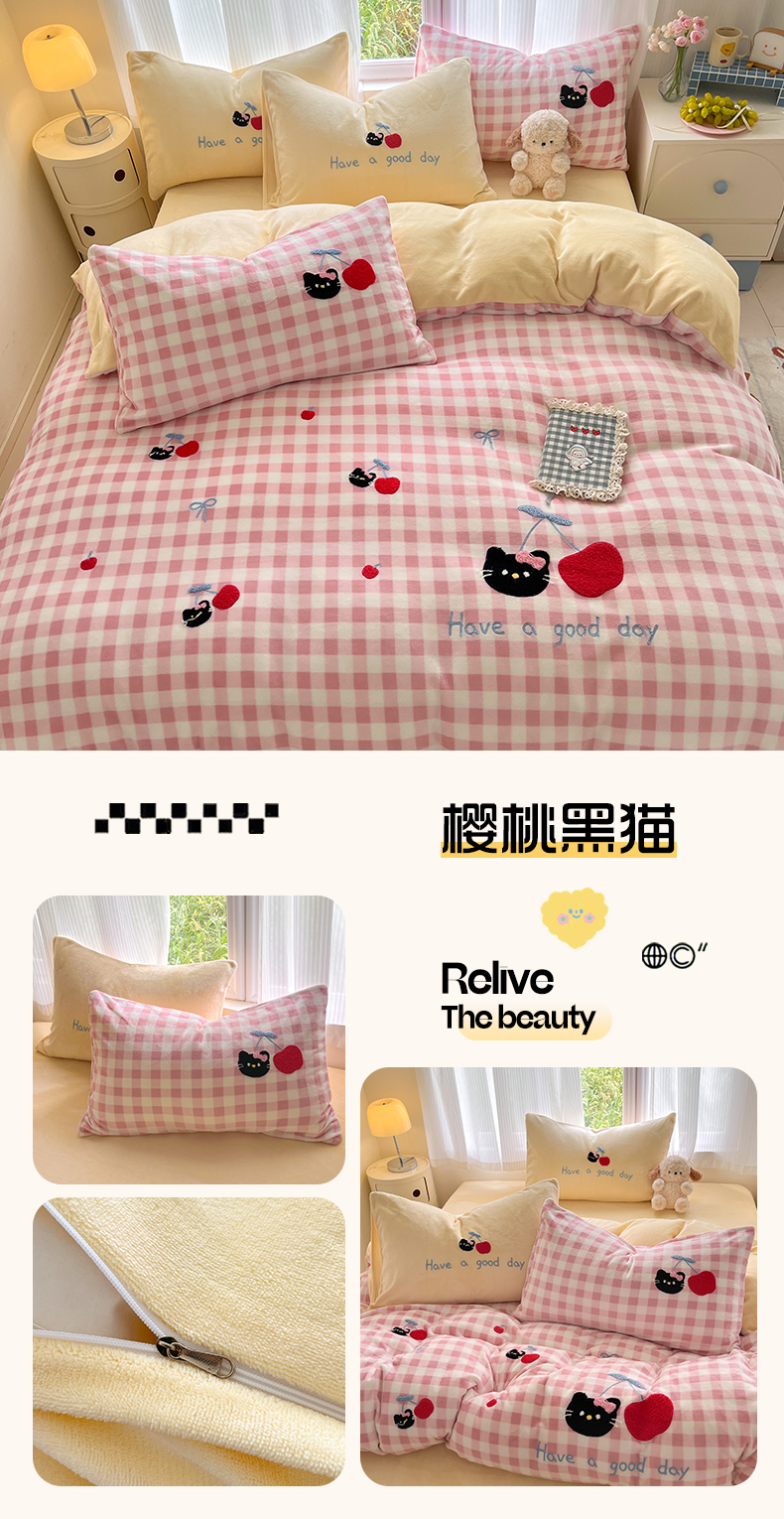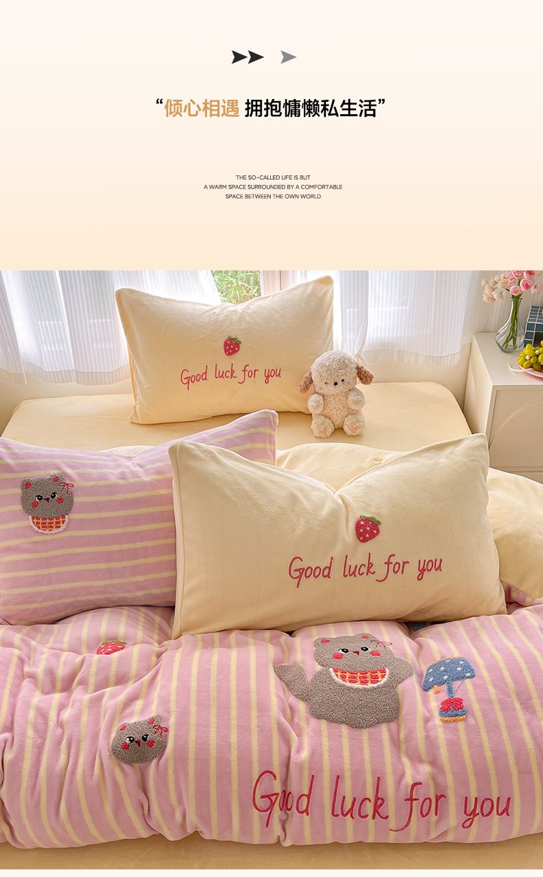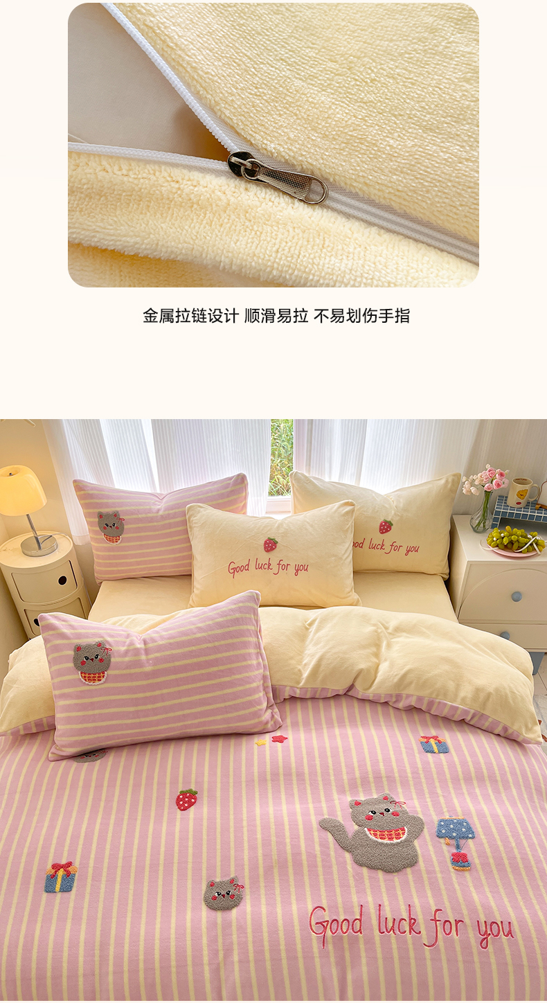 商品名称:如一 2025新款卡通毛巾绣系列牛奶绒四件套第三批 草莓灰猫
