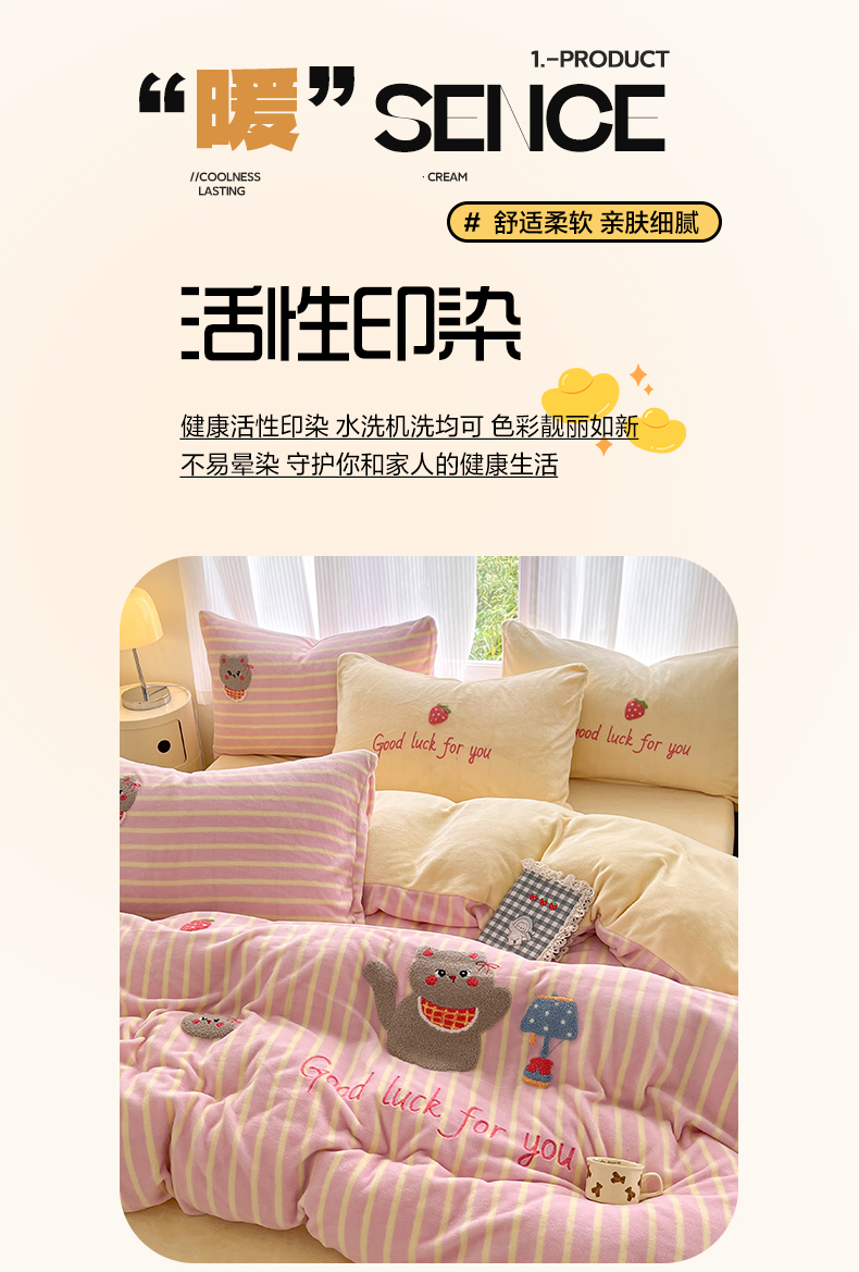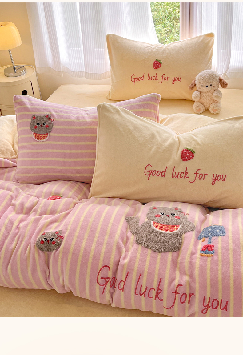 (总)如一 2025新款卡通毛巾绣系列牛奶绒四件套,卡皮柿子,爱心天使,豹纹黑皮,草莓灰猫,蛋糕小狗,粉格小猫,海绵宝宝,快乐企鹅,拉布饼干,蓝格黑猫,领结粉兔,苹果拉布,竖条西高,晚安小象,星星宝贝,星星木马,星星派对,星星苹果,星月猫咪,樱桃黑猫
