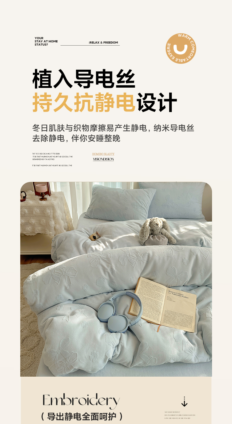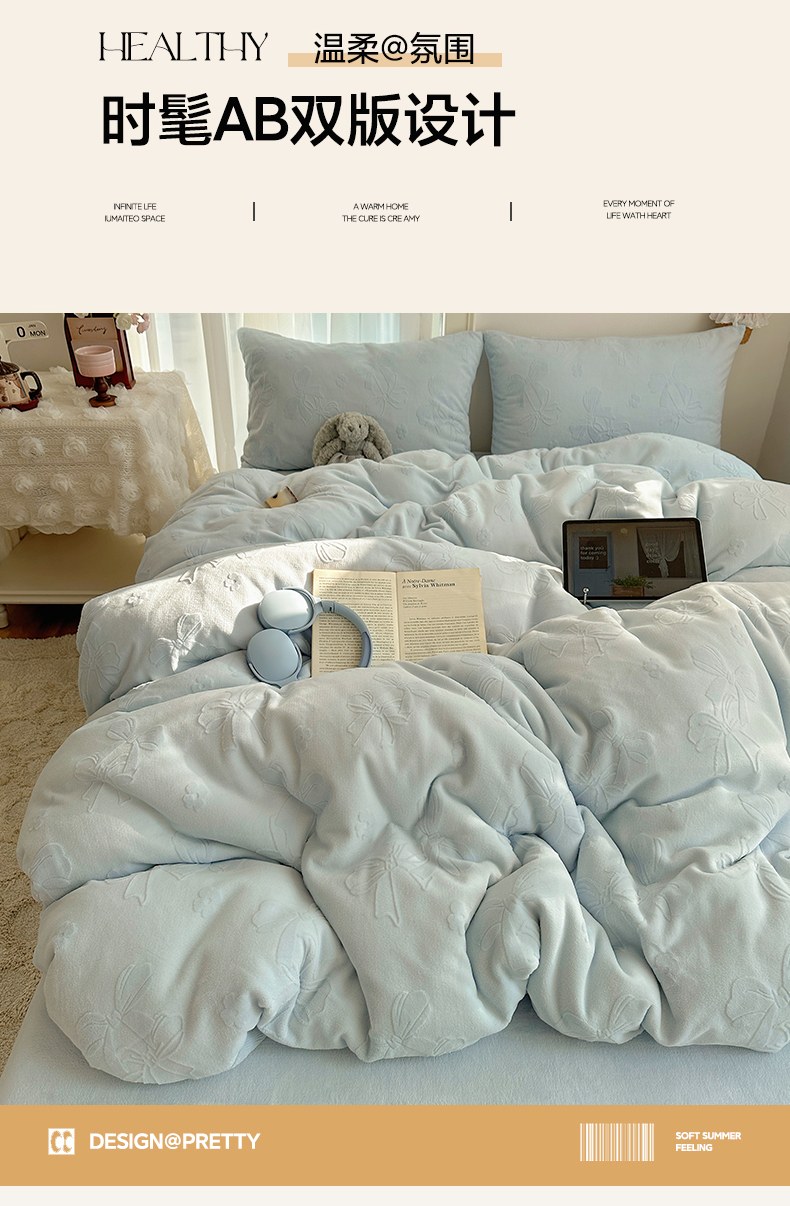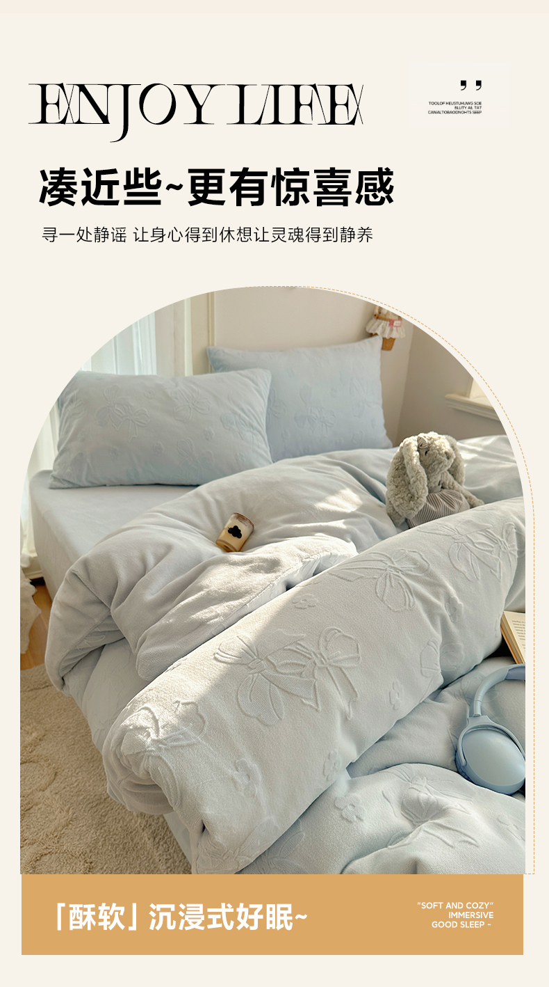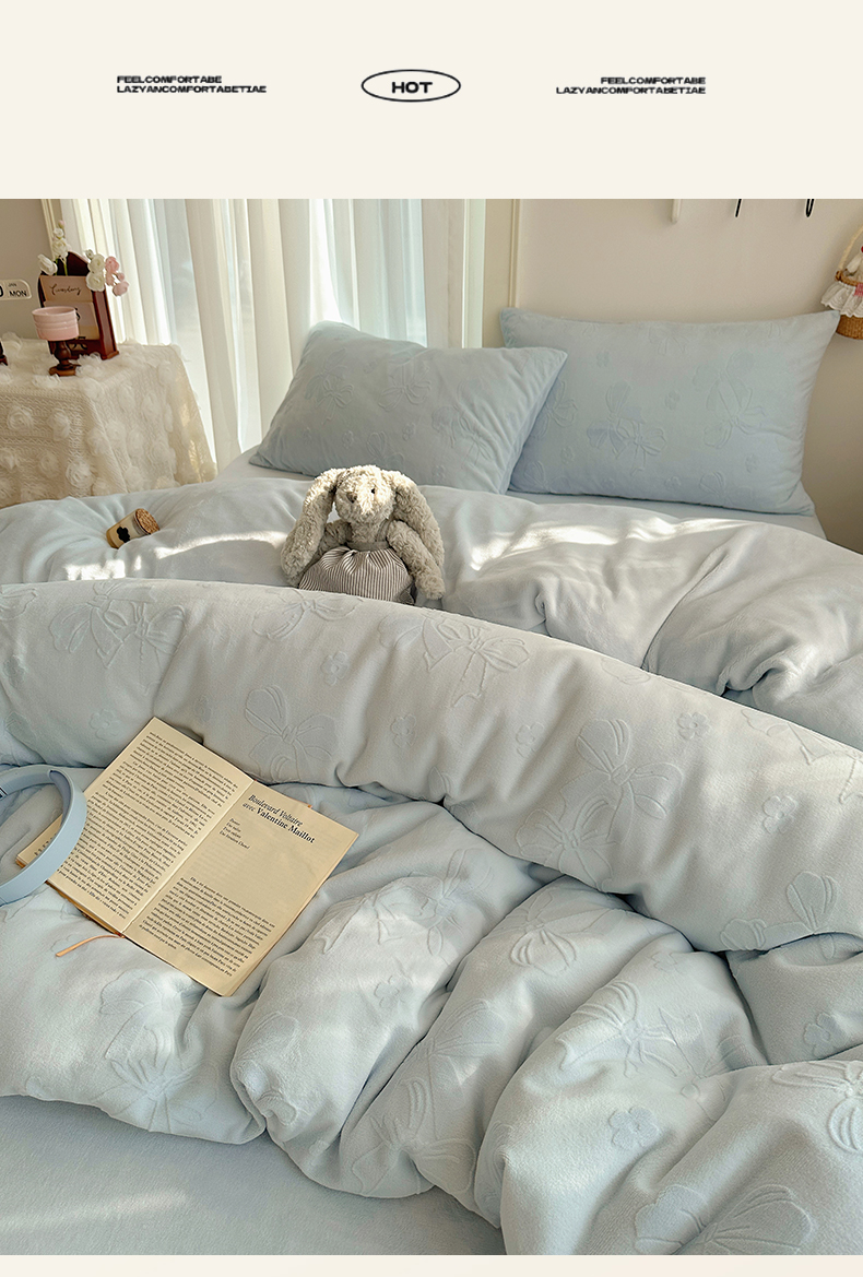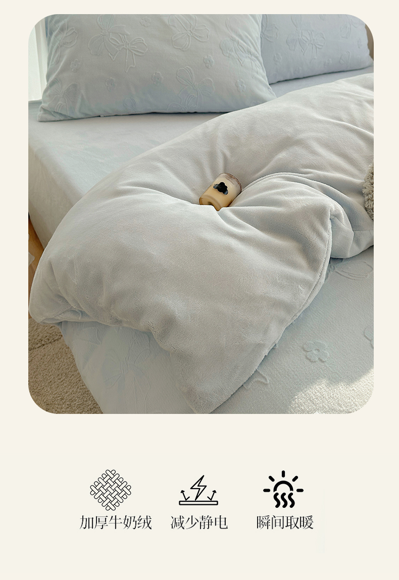 商品名称:瑞钰 2025新款ins博士风蝴蝶全消光雕花暗合牛奶绒四件套 蝴蝶结-浅蓝