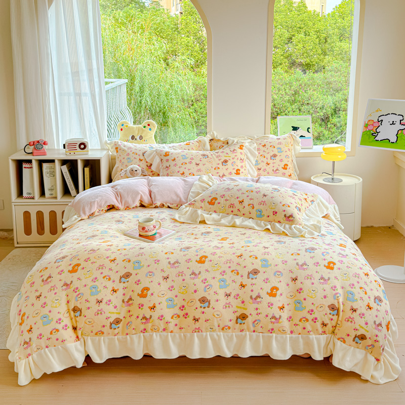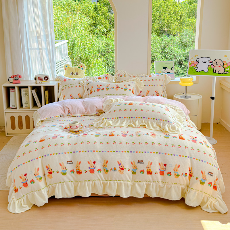 当前位置: 91家纺网 > 商品网购 > 床品套件 > 四件套 > 牛奶绒四件套 > 瑞钰 2025新款韩版花边牛奶绒四件套 小熊来信
