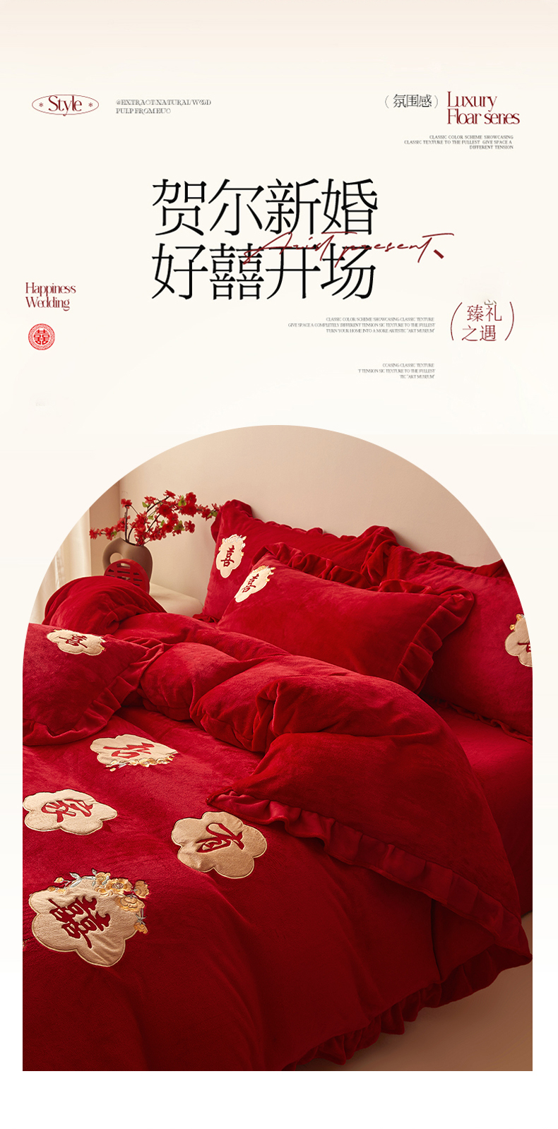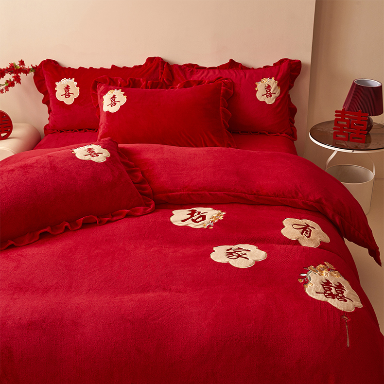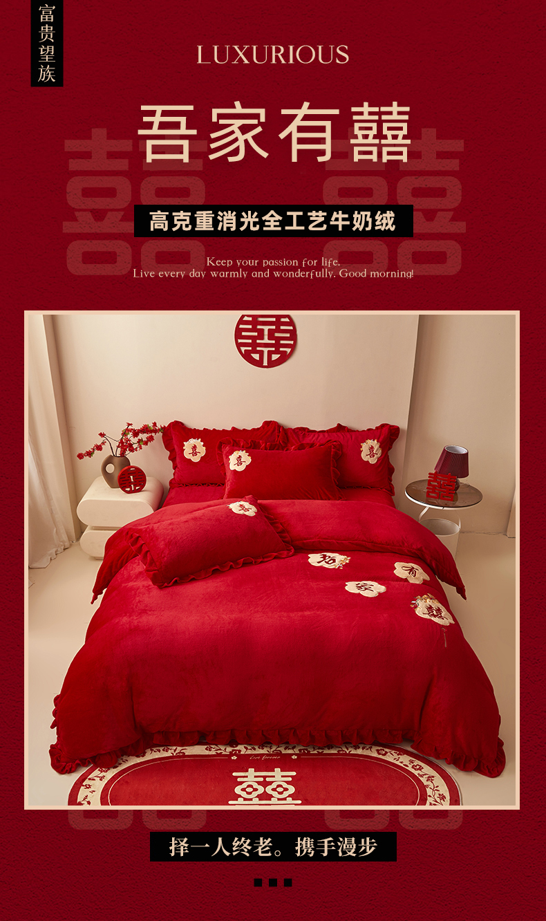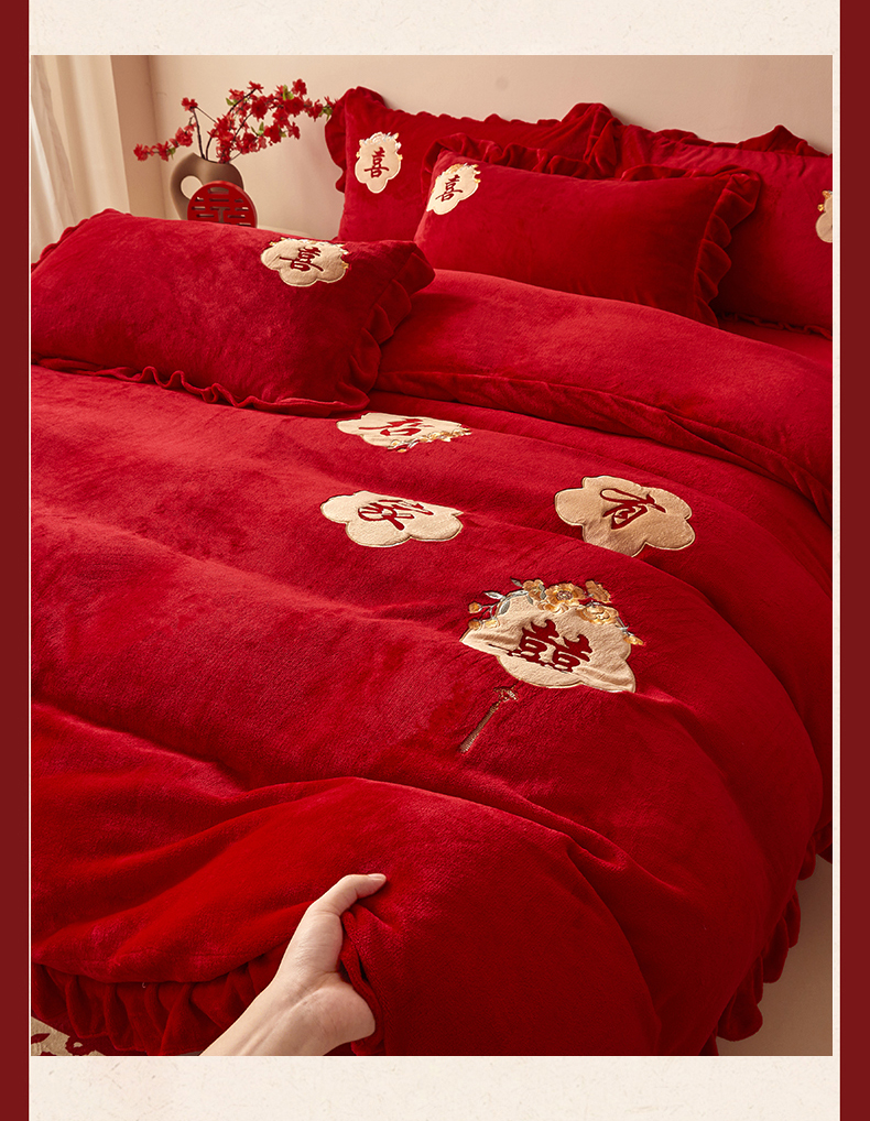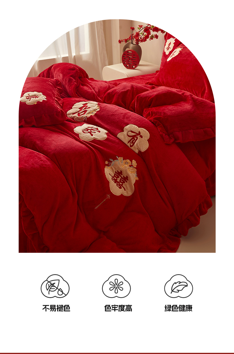 (总)千希家纺 2025新款220克牛奶绒贴布绣婚庆套件(提供买家秀),家有喜事,贴布款-喜樂,吾家有喜