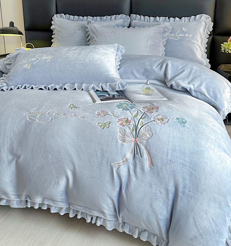 董韵家纺 2025新款高克重 250克9-10斤牛奶绒 刺绣床单四件套系列 柔雾-云烟灰