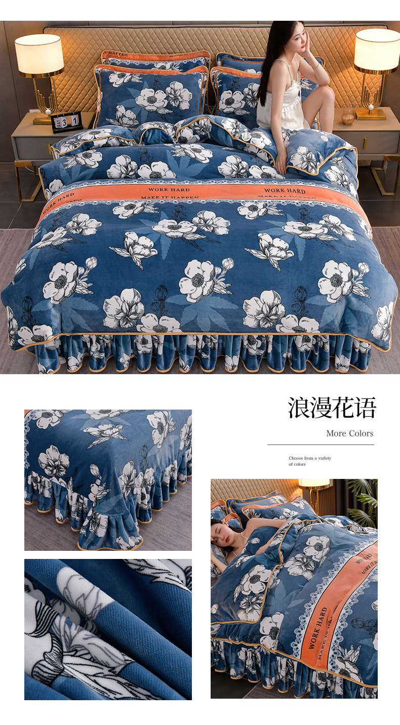 韩秀2025新款金貂牛奶法莱绒床裙款四件套加厚保暖8.5斤金雕绒 浪漫花语,浪漫花语