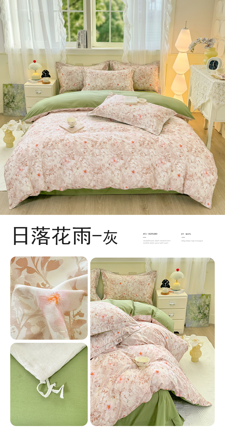 (总)红日子纺织品 2025新款全棉纯棉数码印花四件套,花暖容颜-绿,波斯记忆-蓝,茶山露水-桔,淡雅清风-蓝,芳若-绿,花情共舞-米,焕彩玫瑰-黄,美尼尔-粉,莫兰迪-紫,莫妮花园-粉,浓情蜜意-粉,翩翩花语-绿,秋日盛情-黄,日落花雨-灰,如若梦境-绿,诗丹娜-深蓝,邂逅柔情-蓝,秀雅佳人-灰