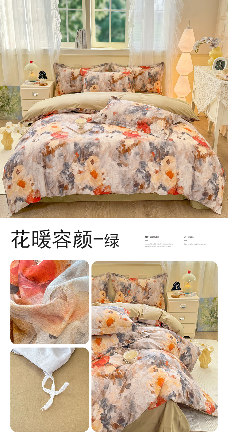 (总)红日子纺织品 2025新款全棉纯棉数码印花四件套,花暖容颜-绿,波斯记忆-蓝,茶山露水-桔,淡雅清风-蓝,芳若-绿,花情共舞-米,焕彩玫瑰-黄,美尼尔-粉,莫兰迪-紫,莫妮花园-粉,浓情蜜意-粉,翩翩花语-绿,秋日盛情-黄,日落花雨-灰,如若梦境-绿,诗丹娜-深蓝,邂逅柔情-蓝,秀雅佳人-灰