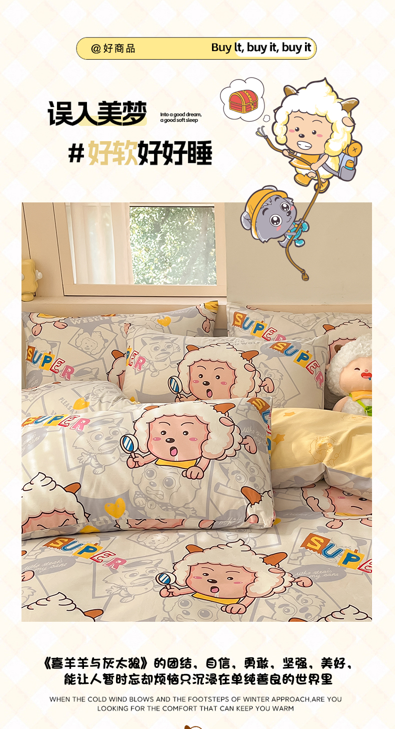 商品名称:金鑫汇家纺 2025新款喜羊羊与灰太狼全棉单品枕套 探索懒羊羊