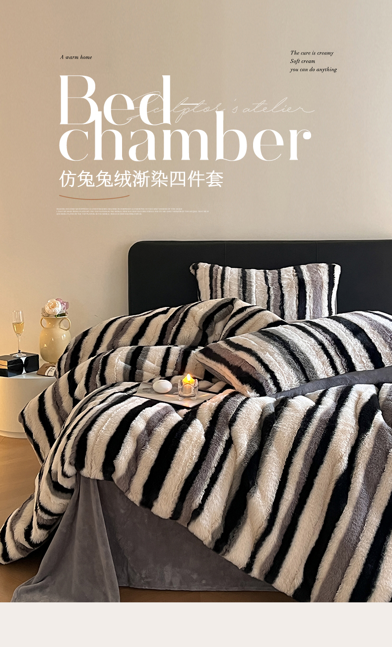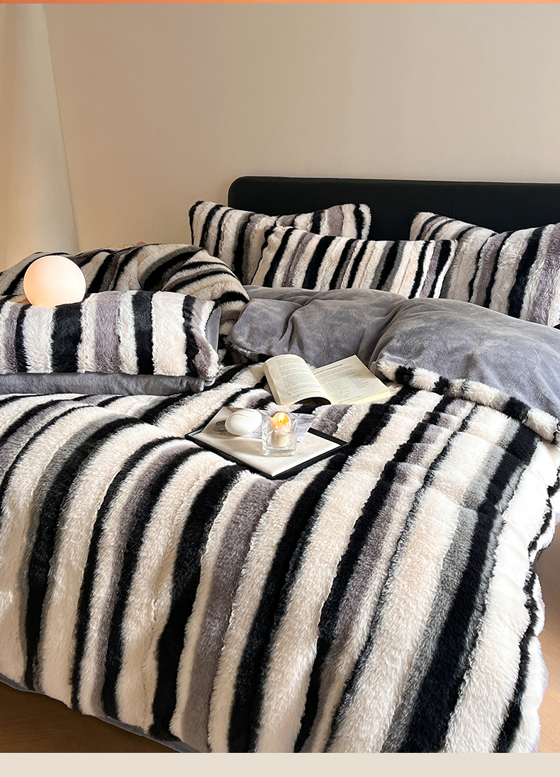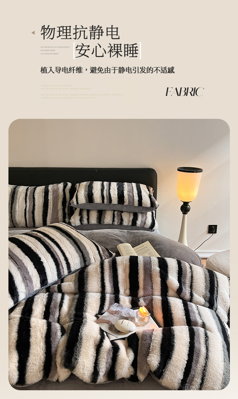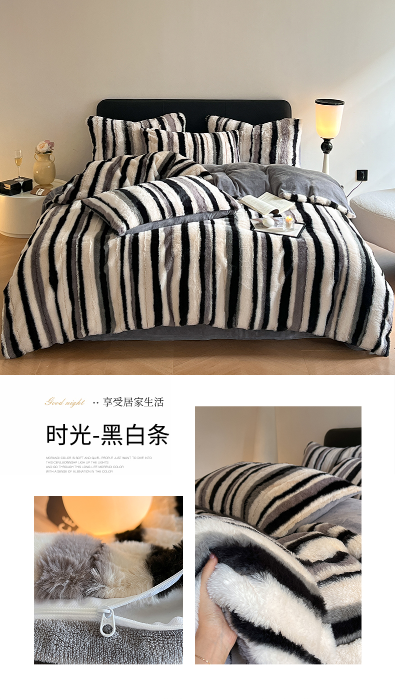 玖琳家纺 2025新款双面高端高克重兔绒毛牛奶绒轻奢款四件套- 时光系列 黑白条