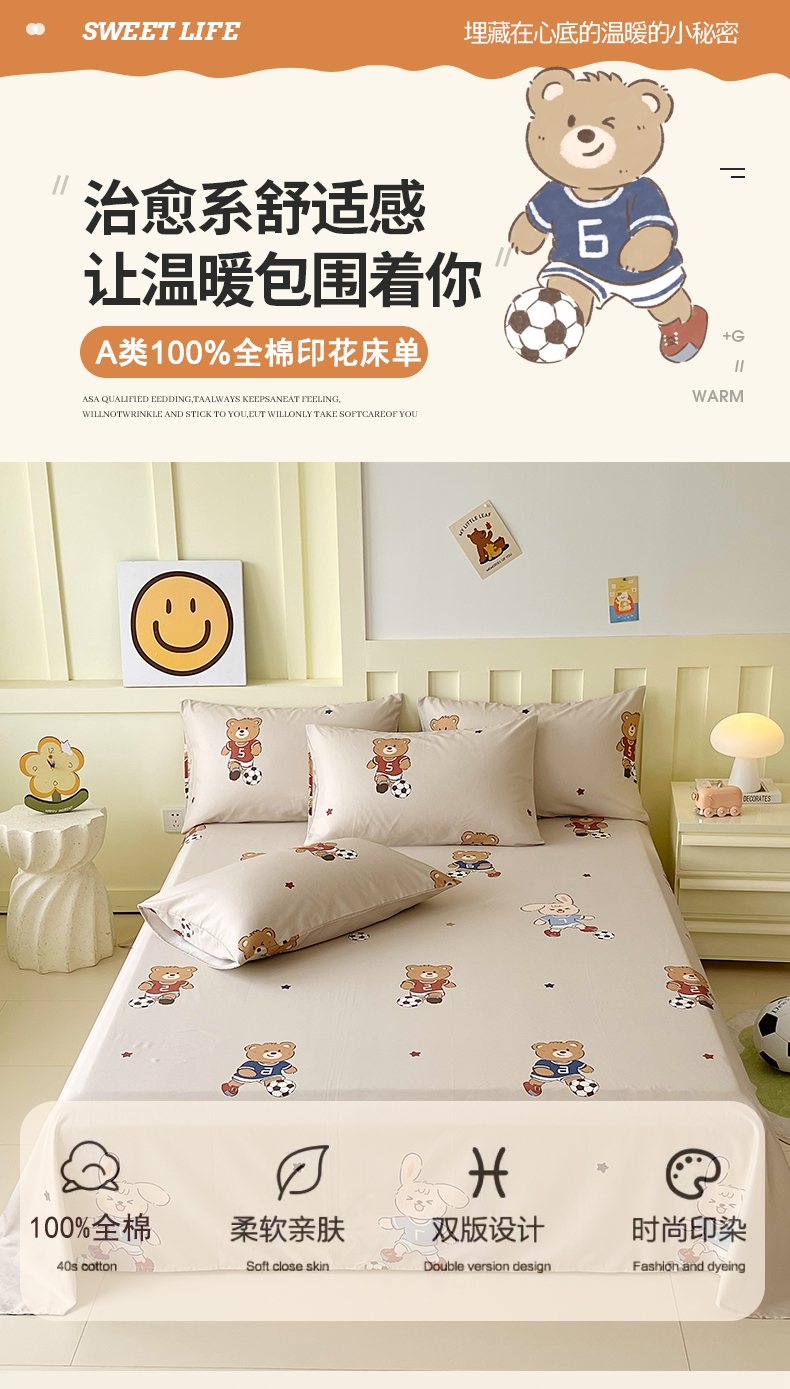 金鑫汇家纺 2026新款13070全棉单品套件系列-成人床A版单床单 友谊足球