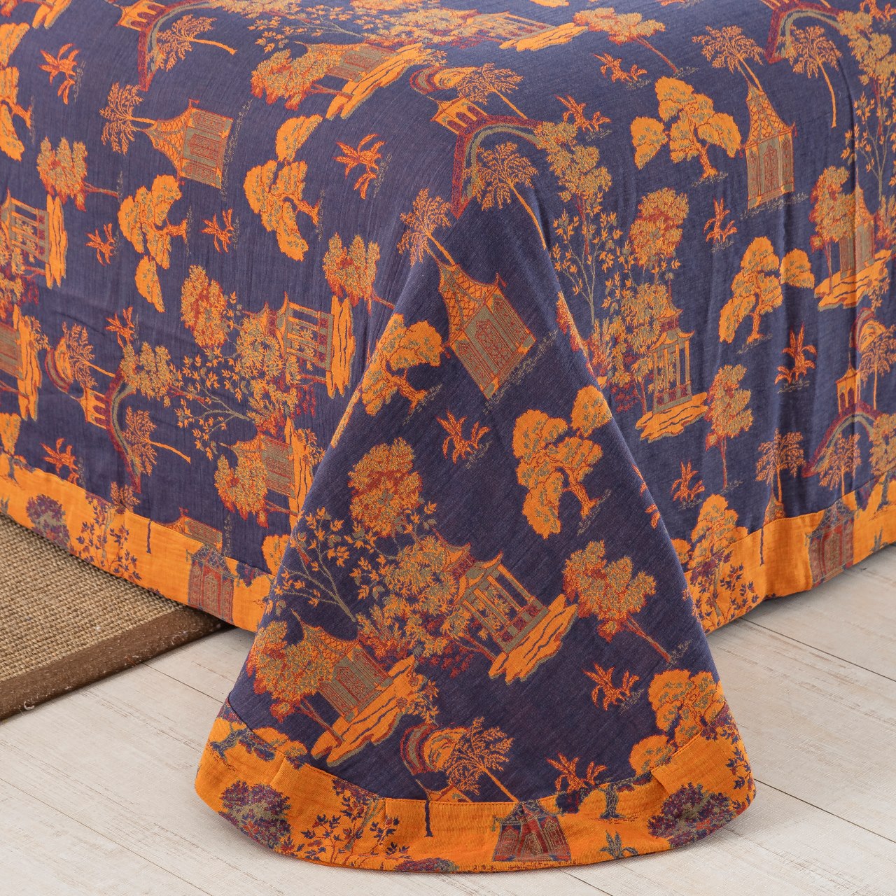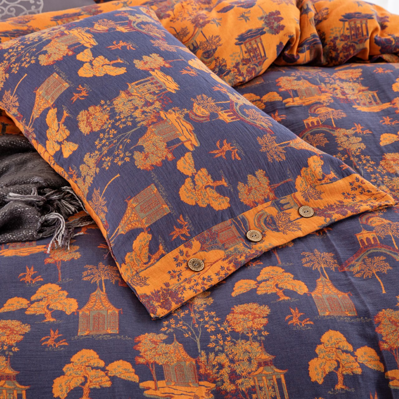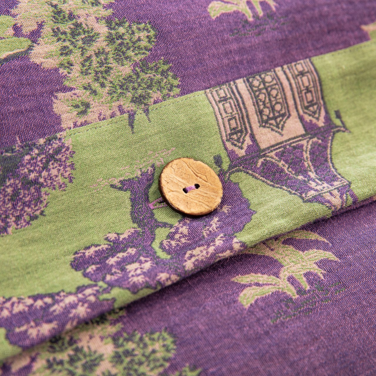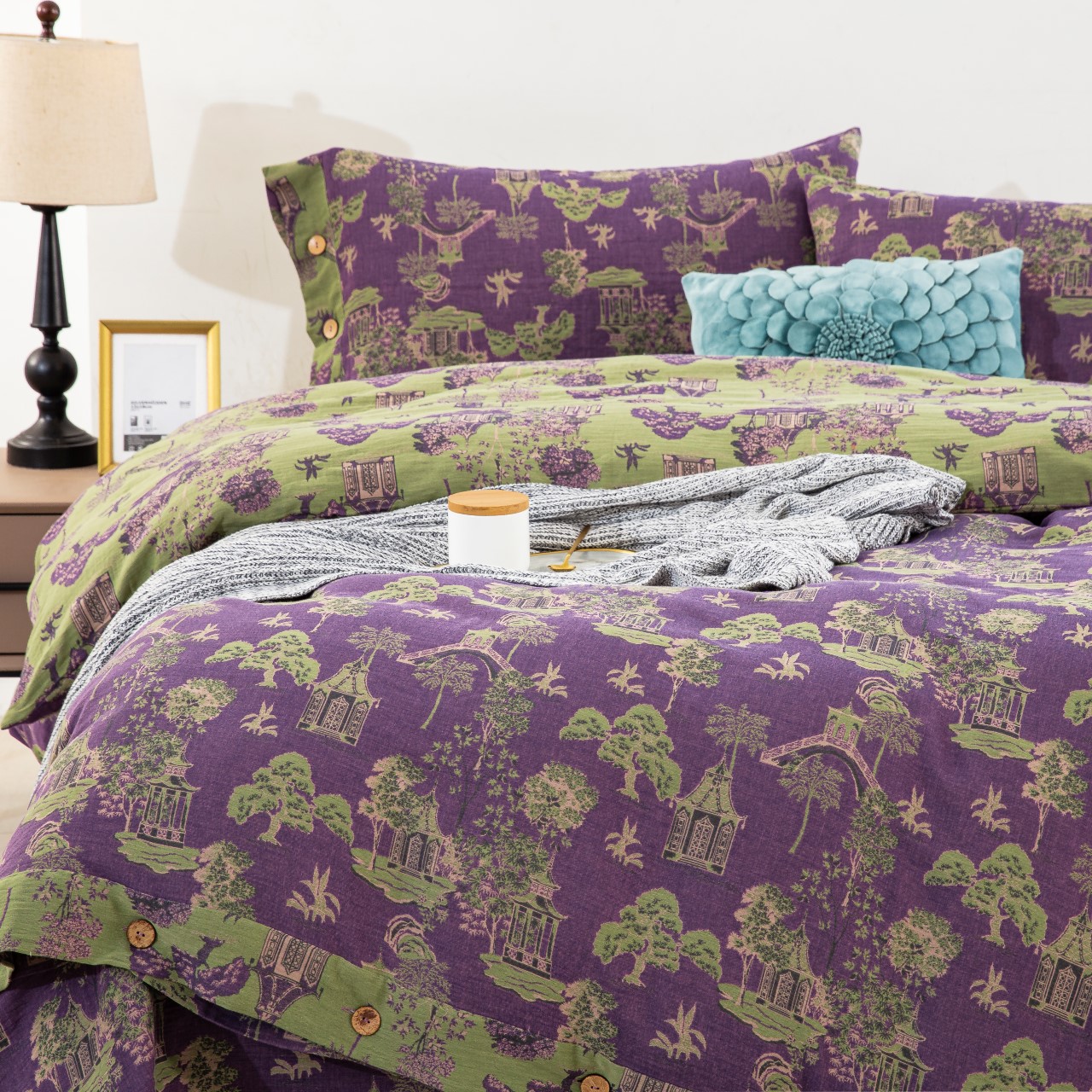 商品名称:仰望棉麻双层纱供应链 2026新款全棉色织提花纽扣款四件套--森林庭院 森林庭院-紫