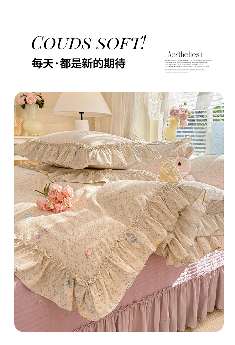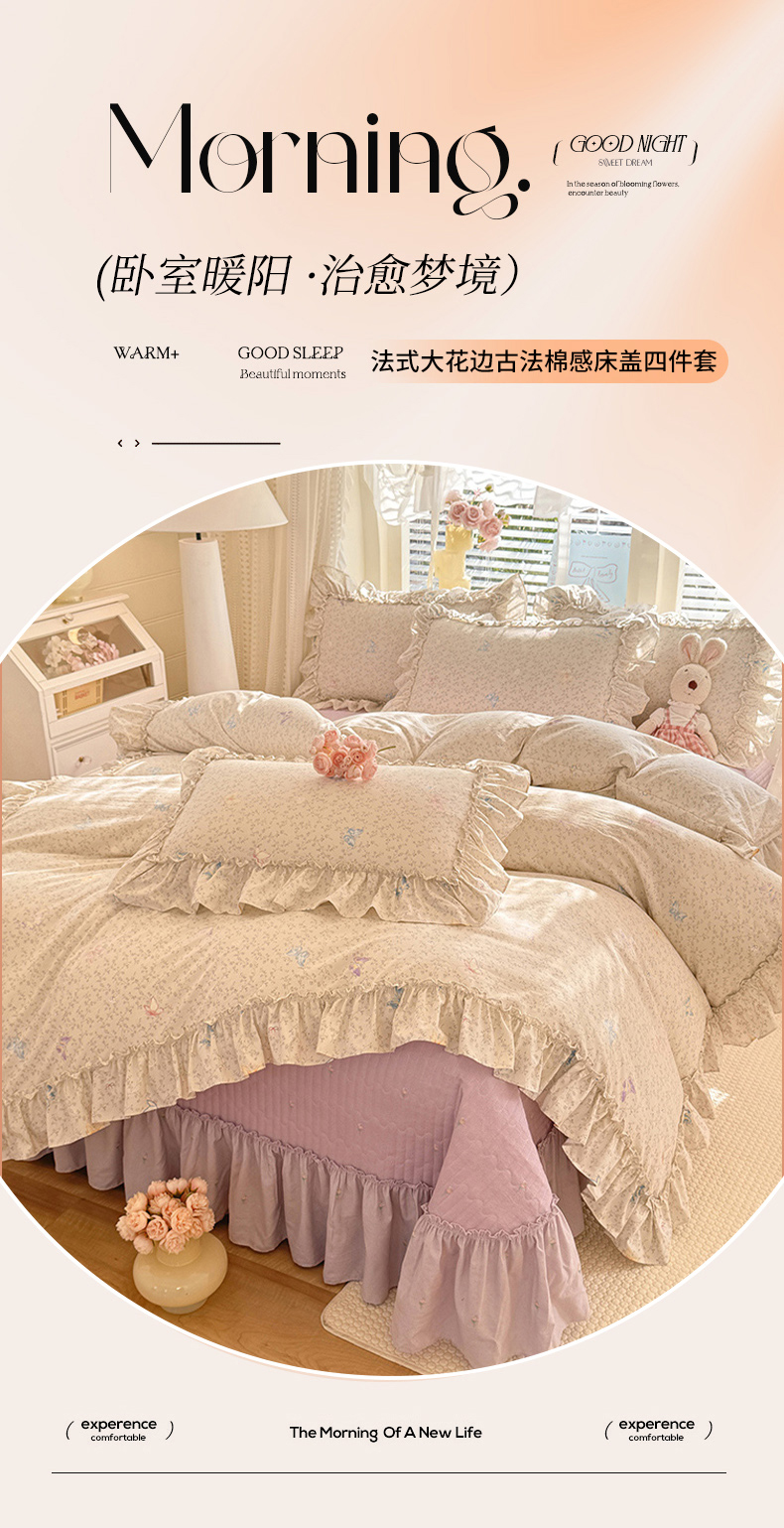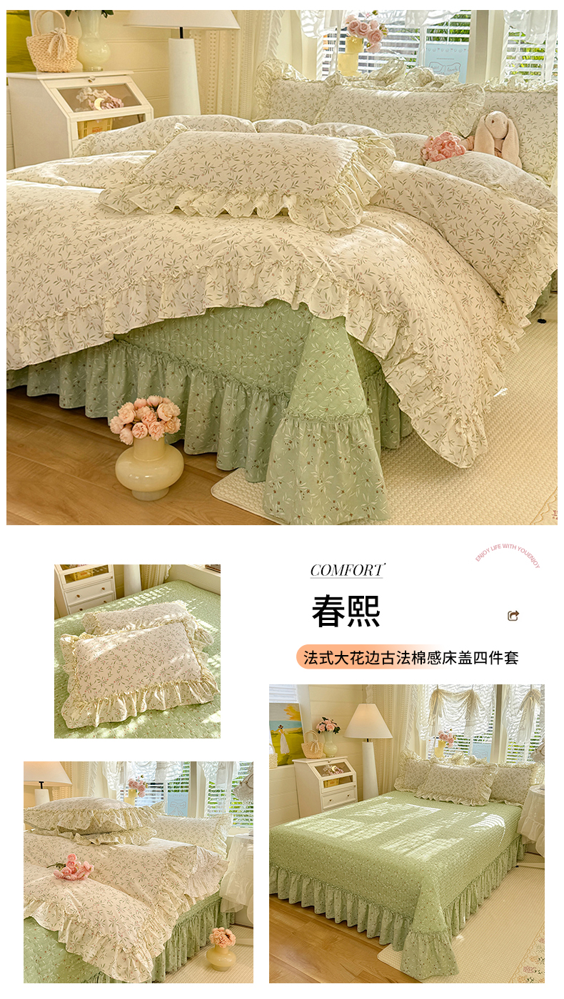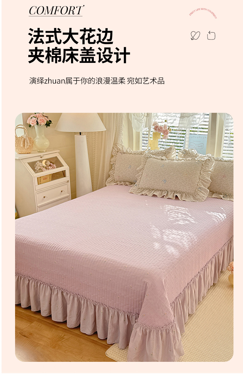 当前位置: 91家纺网 > 商品网购 > 床品套件 > 四件套 > 其它四件套 > 韩约家纺 2026新款法式大花边古法棉感床盖四件套 紫妍