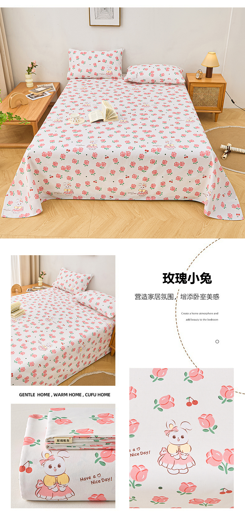 • 91家纺网 家纺一手货源 找家纺 首爱家纺 2026新款爆款印花原棉老粗布床单 小花 lucky兔