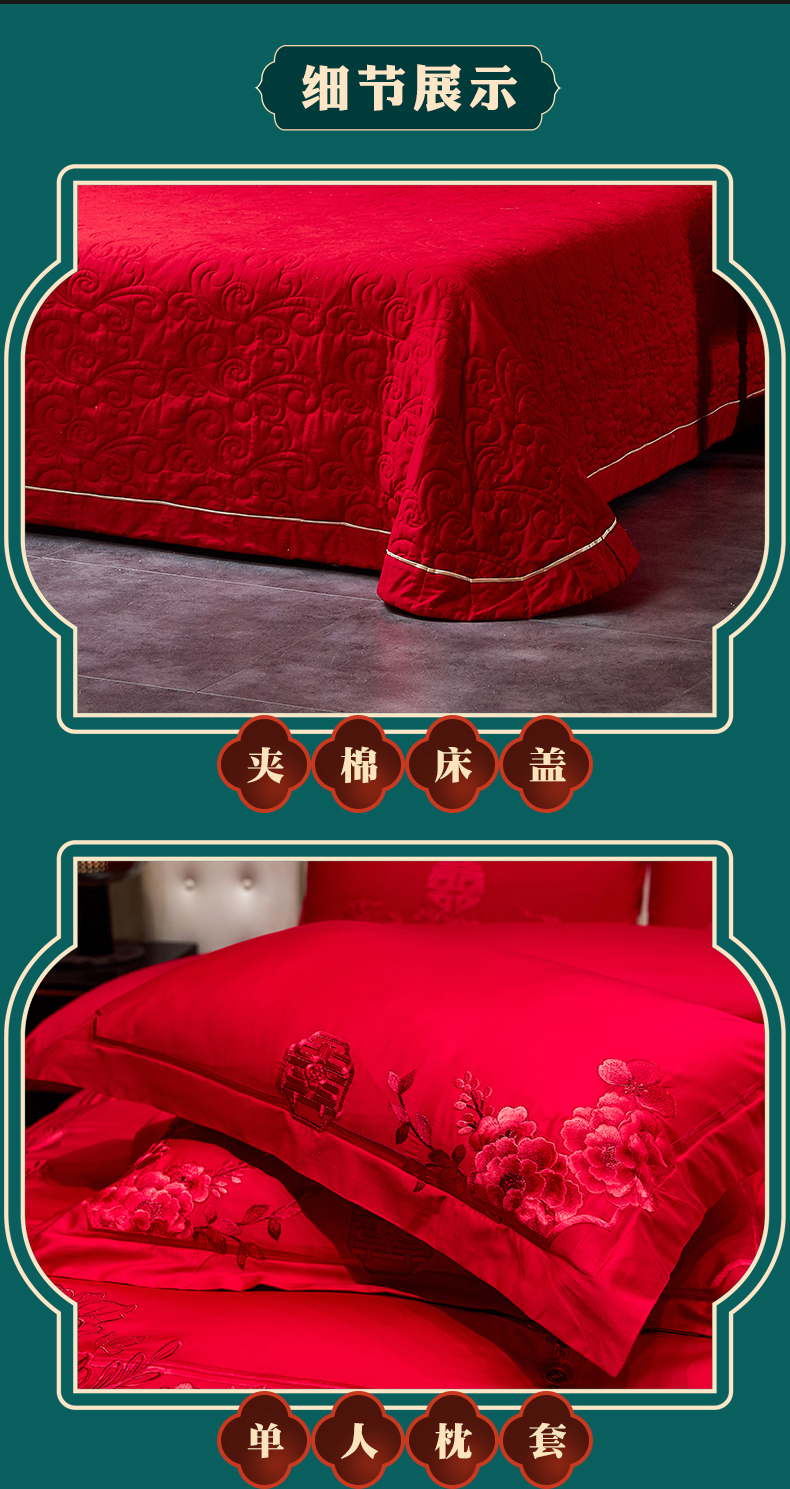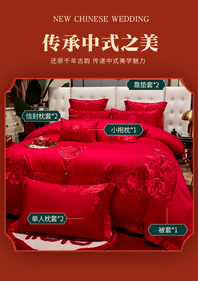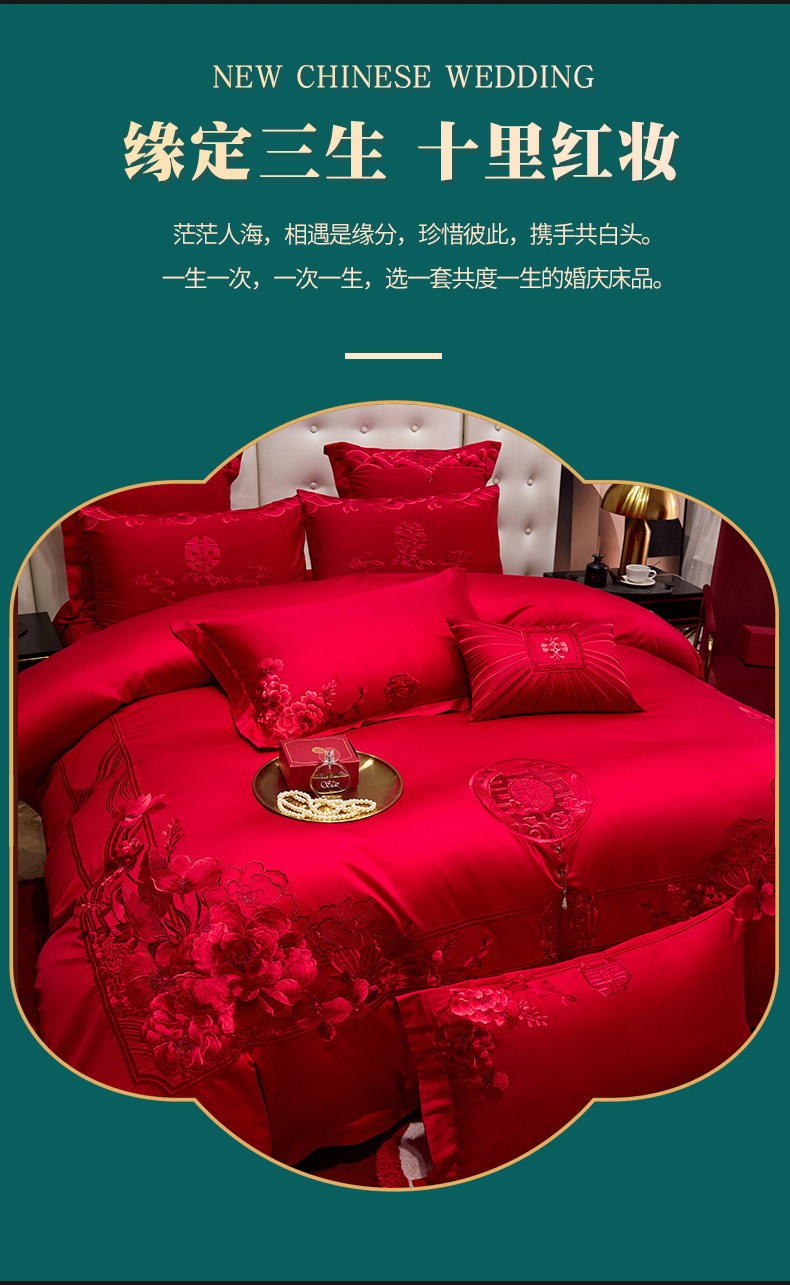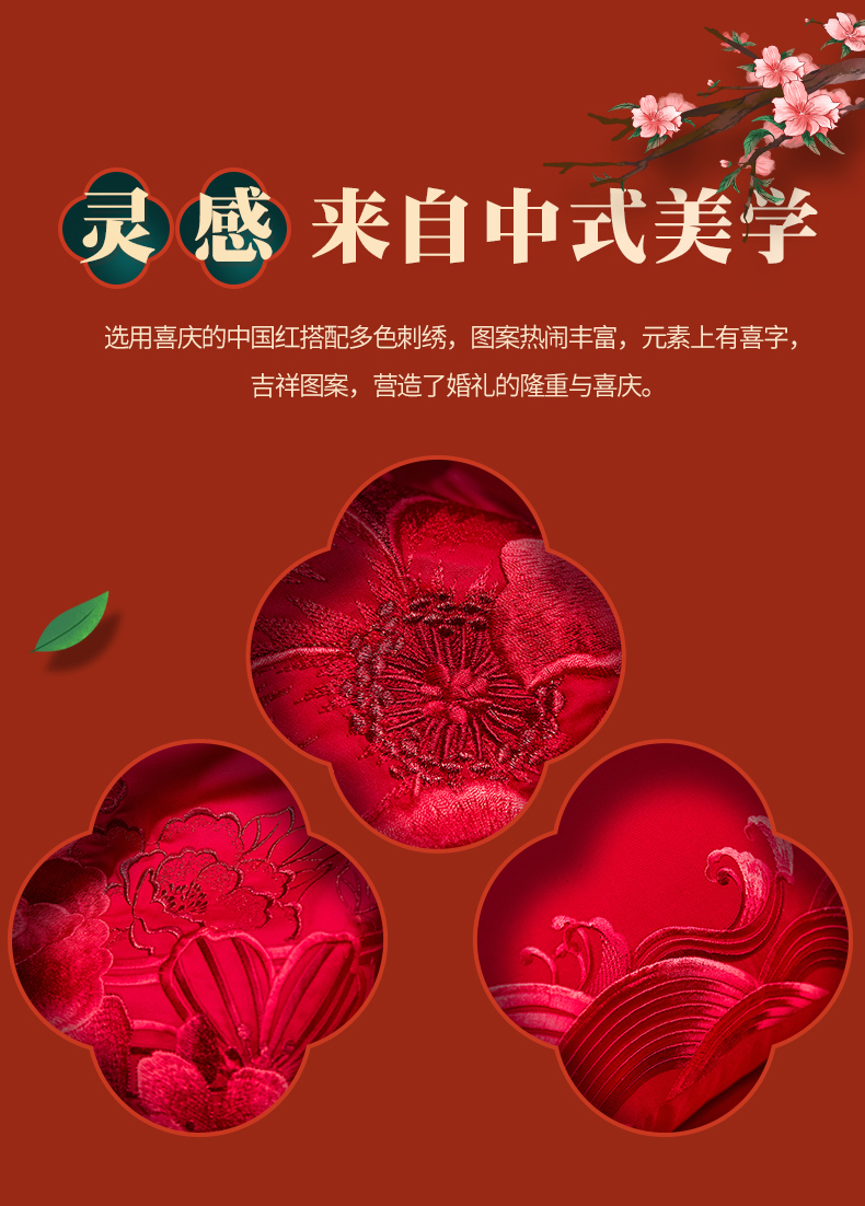当前位置: 91家纺网 > 商品网购 > 床品套件 > 四件套 > 婚庆四件套 > 红番天婚庆 2026新款全棉刺绣新中式婚庆四件套多件套 禧绣盈门-红-时尚