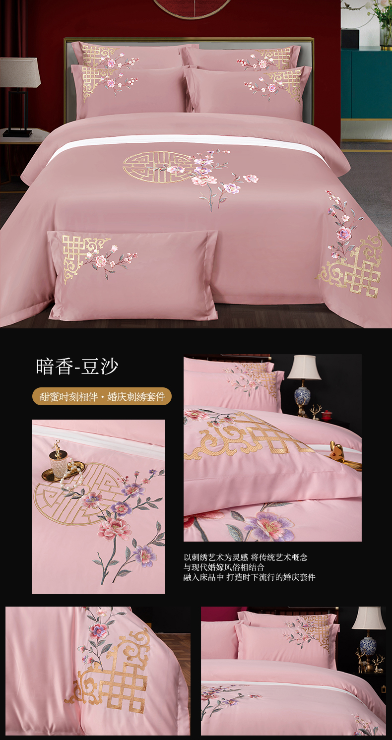 慕她家纺 2026年全棉纯棉婚庆四件套大红色刺绣结床上用品 倾心 粉玉