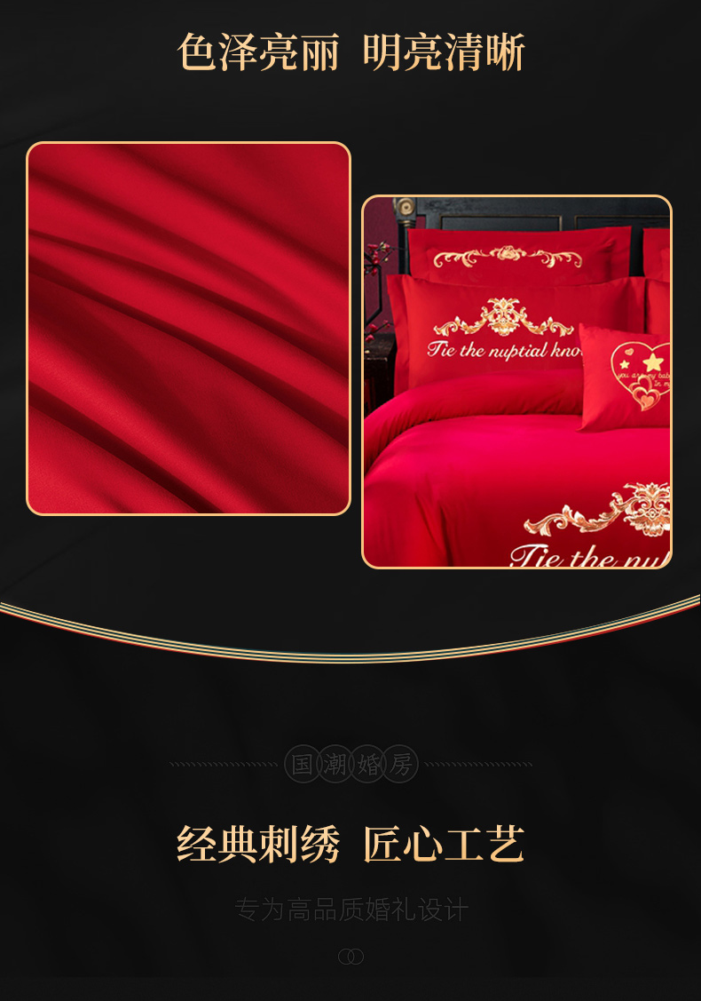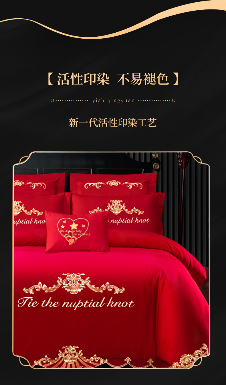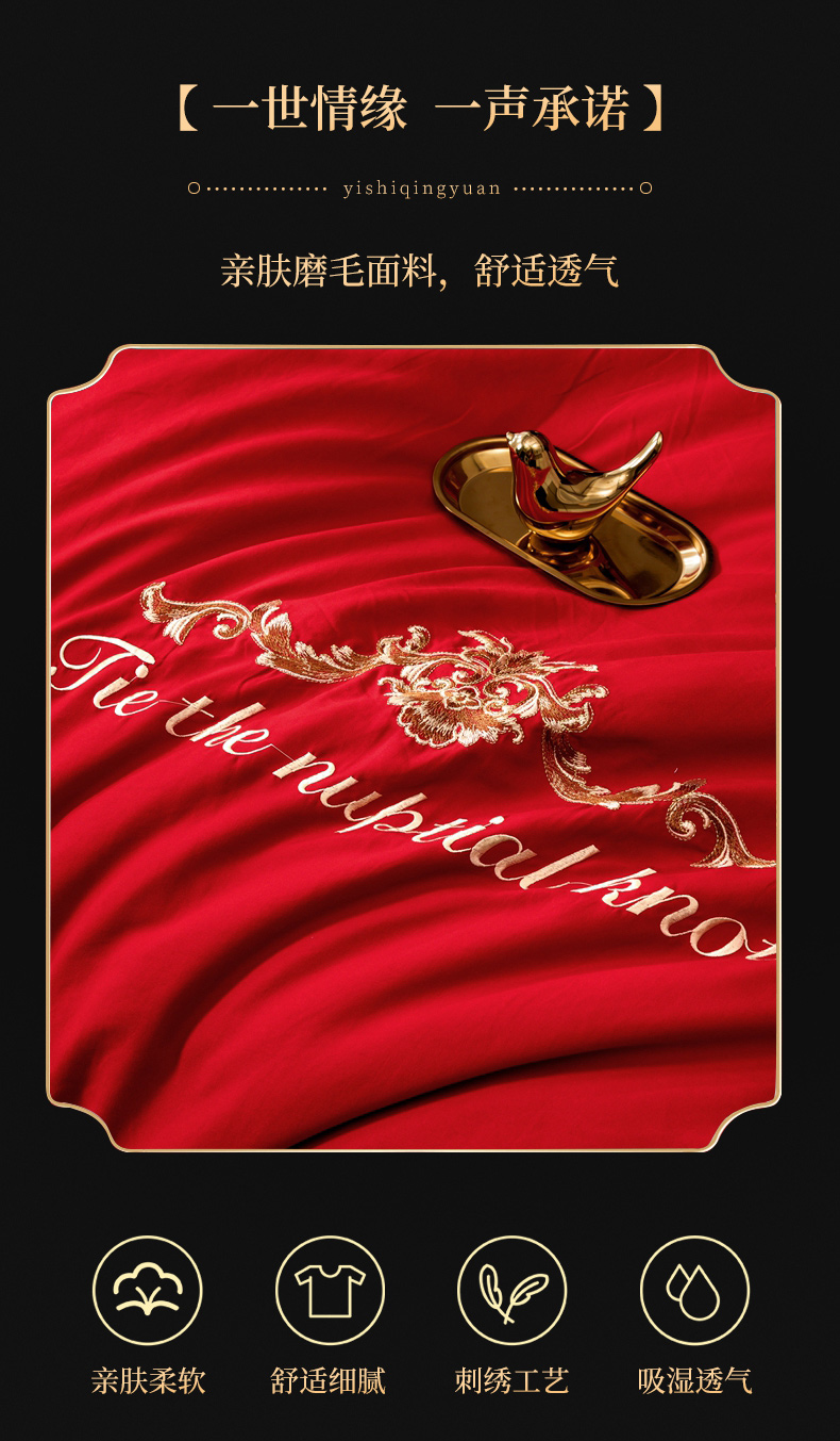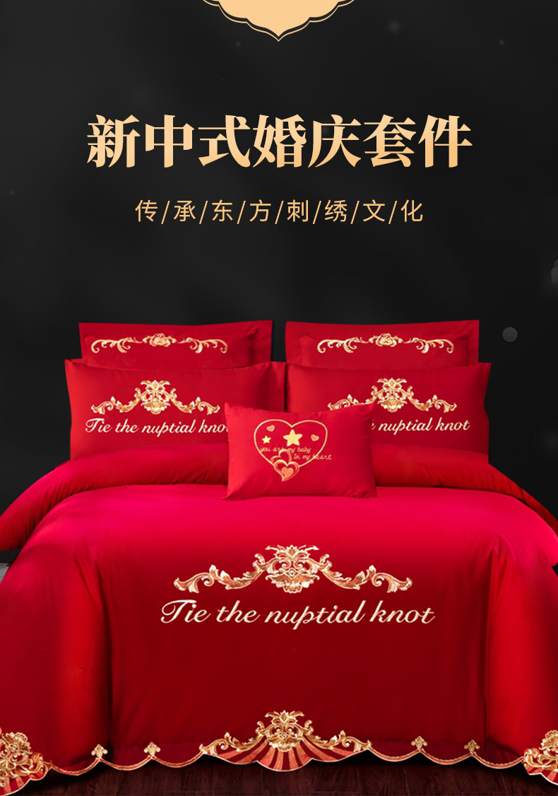 当前位置: 91家纺网 > 商品网购 > 床品套件 > 四件套 > 婚庆四件套 > 慕她家纺 2026年磨毛亲肤棉婚庆四件套大红色刺绣结床上用品 天缘巧合