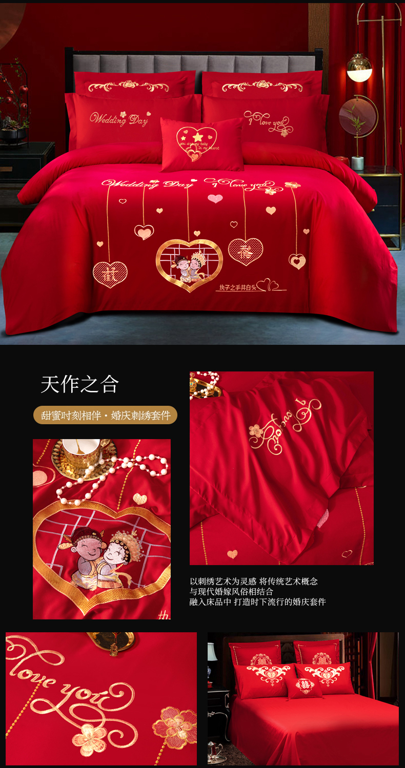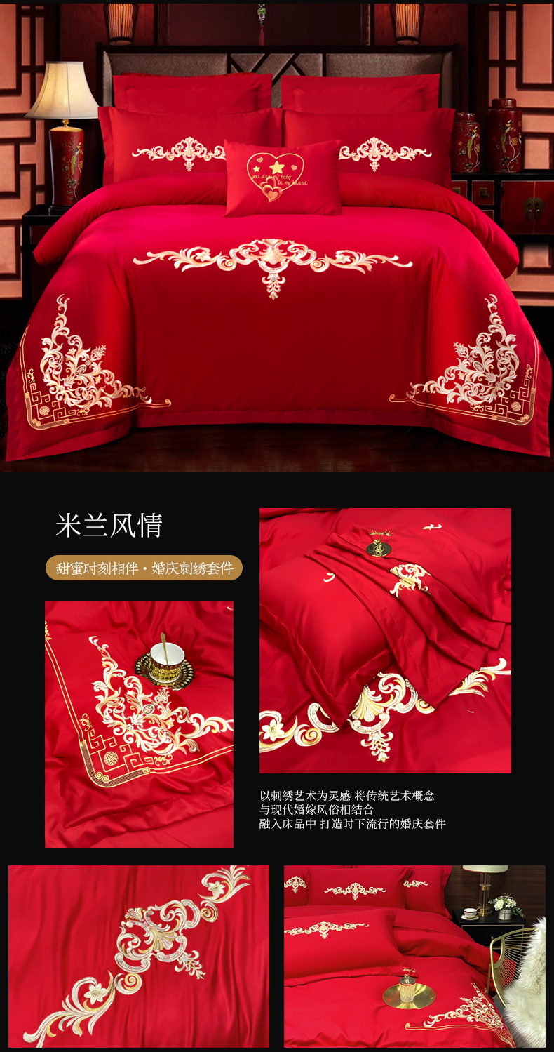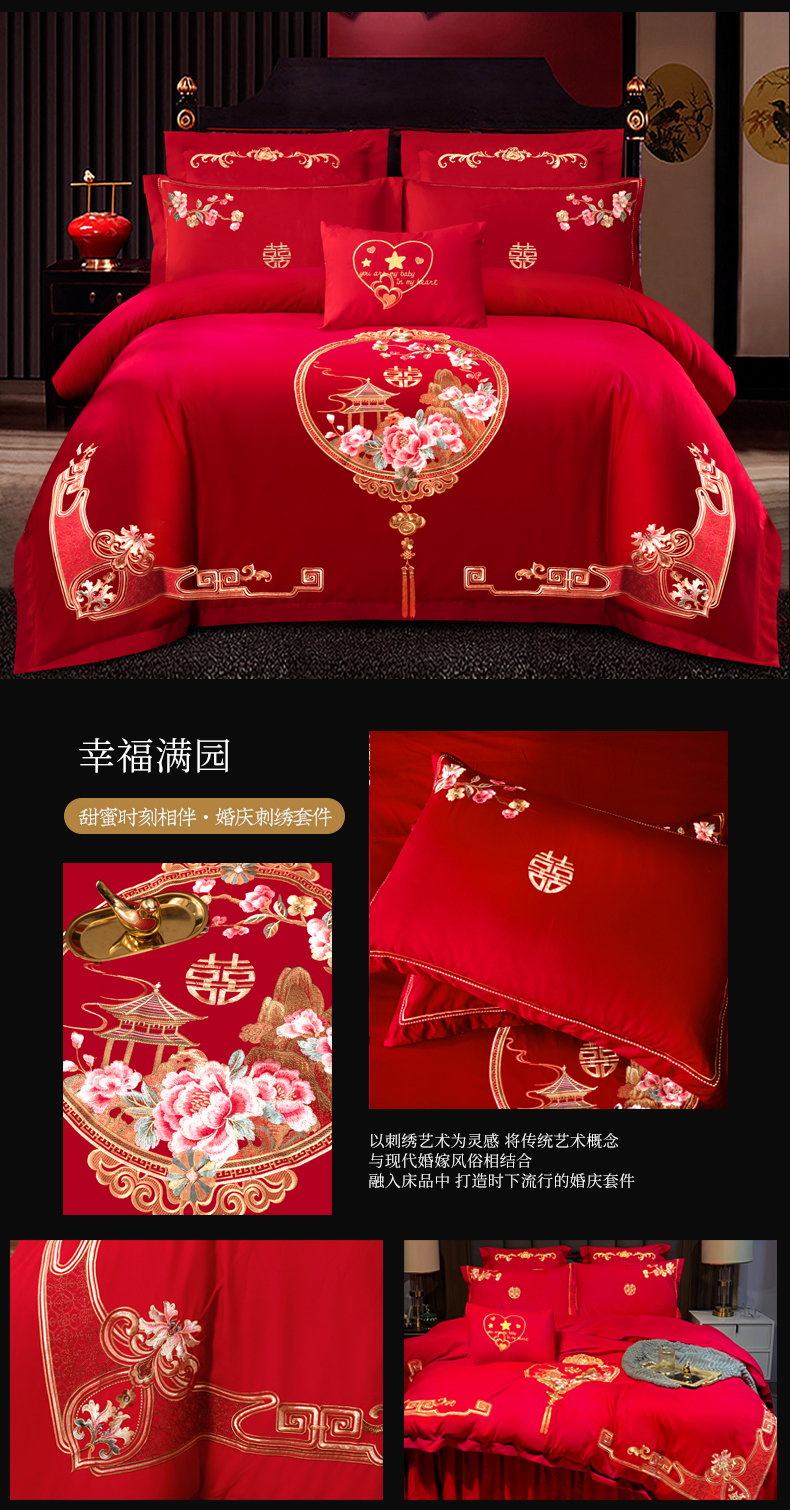 当前位置: 91家纺网 > 商品网购 > 床品套件 > 四件套 > 婚庆四件套 > 慕她家纺 2026年磨毛亲肤棉婚庆四件套大红色刺绣结床上用品 盛世庄园 雅豆沙