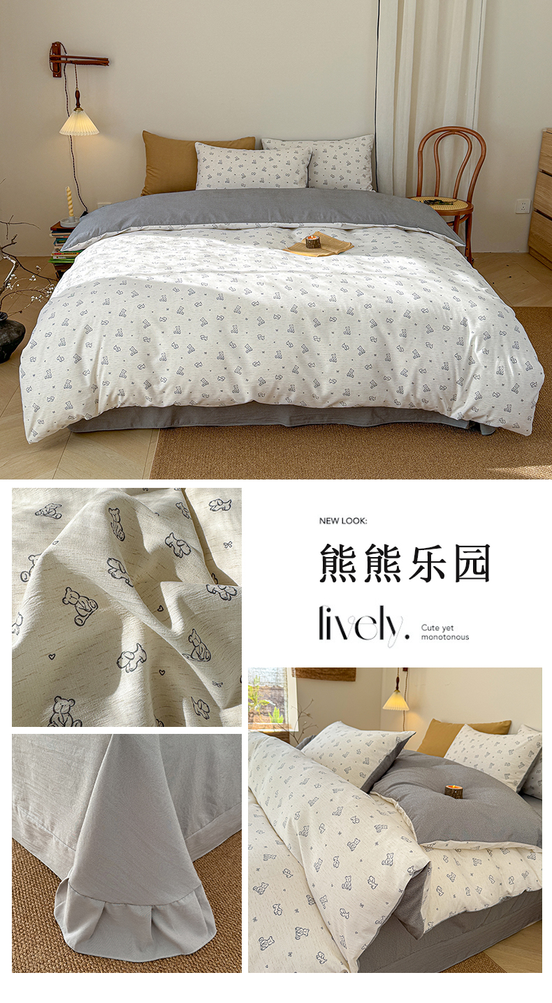 铺尚美家纺 2026春夏新品色织棉麻棉纱小露麻系列皱皱纱四件套 棋盘格小熊