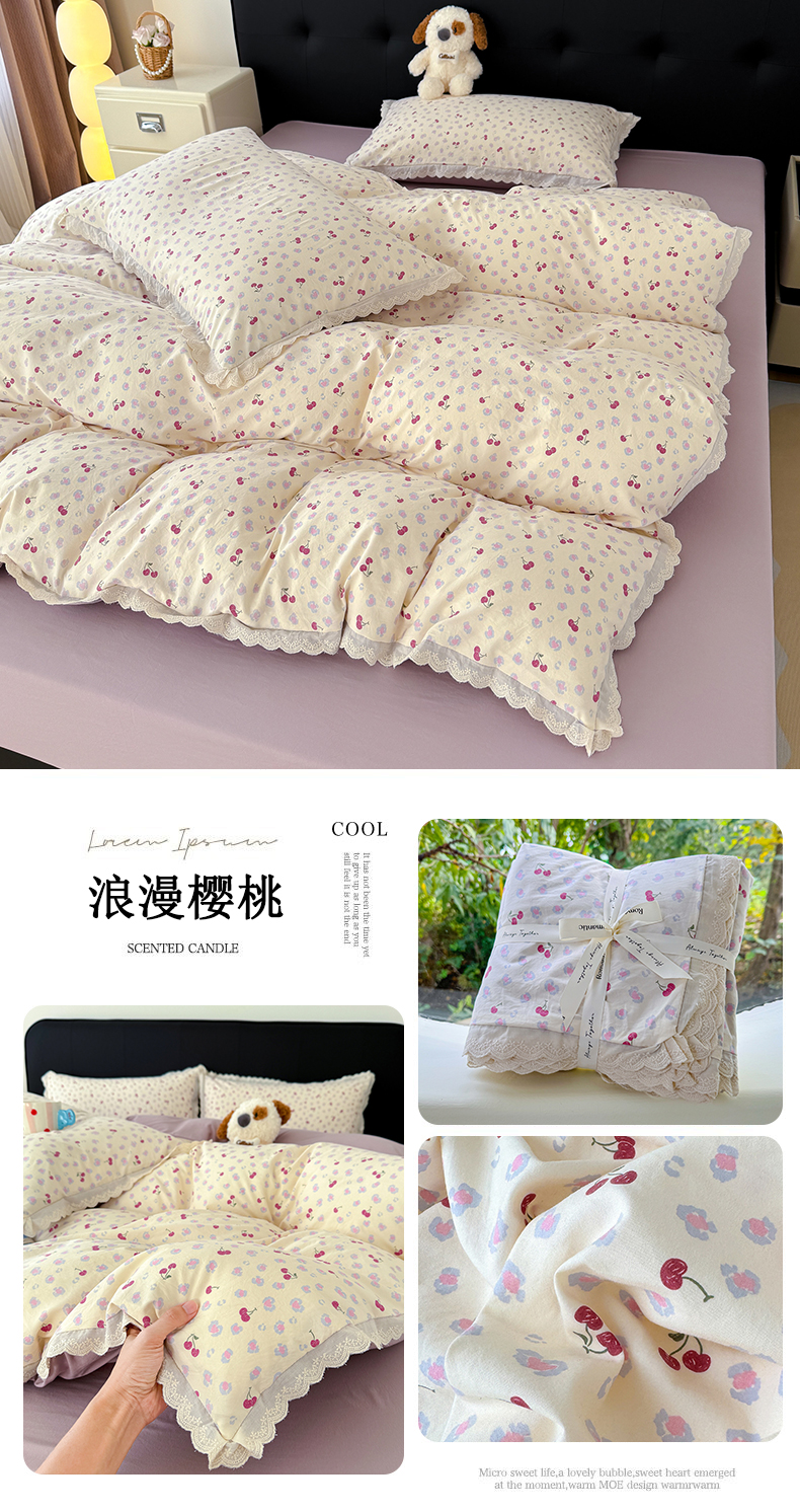 商品名称:铺尚美家纺 2026新款田园韩版花边款小碎花古法水洗仿棉A类云感棉四件套 仲夏晚樱