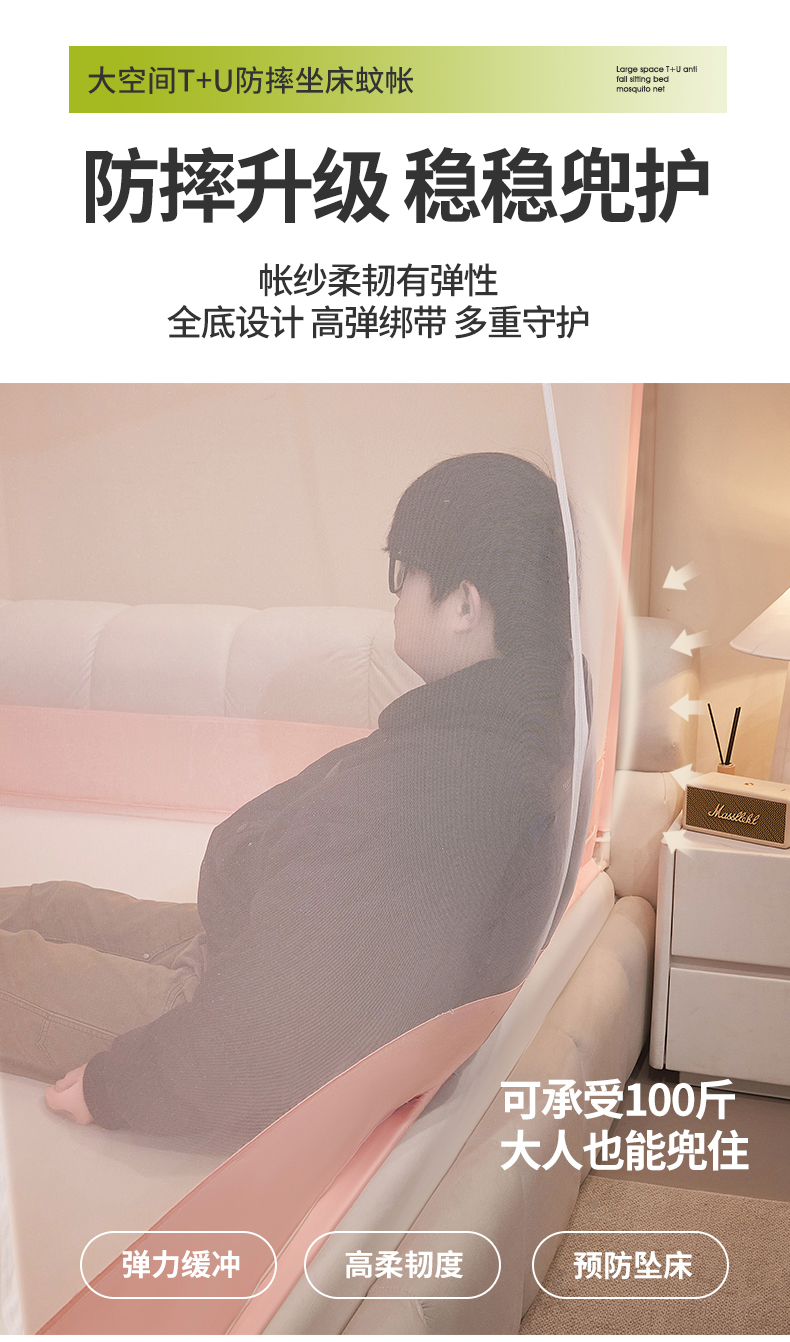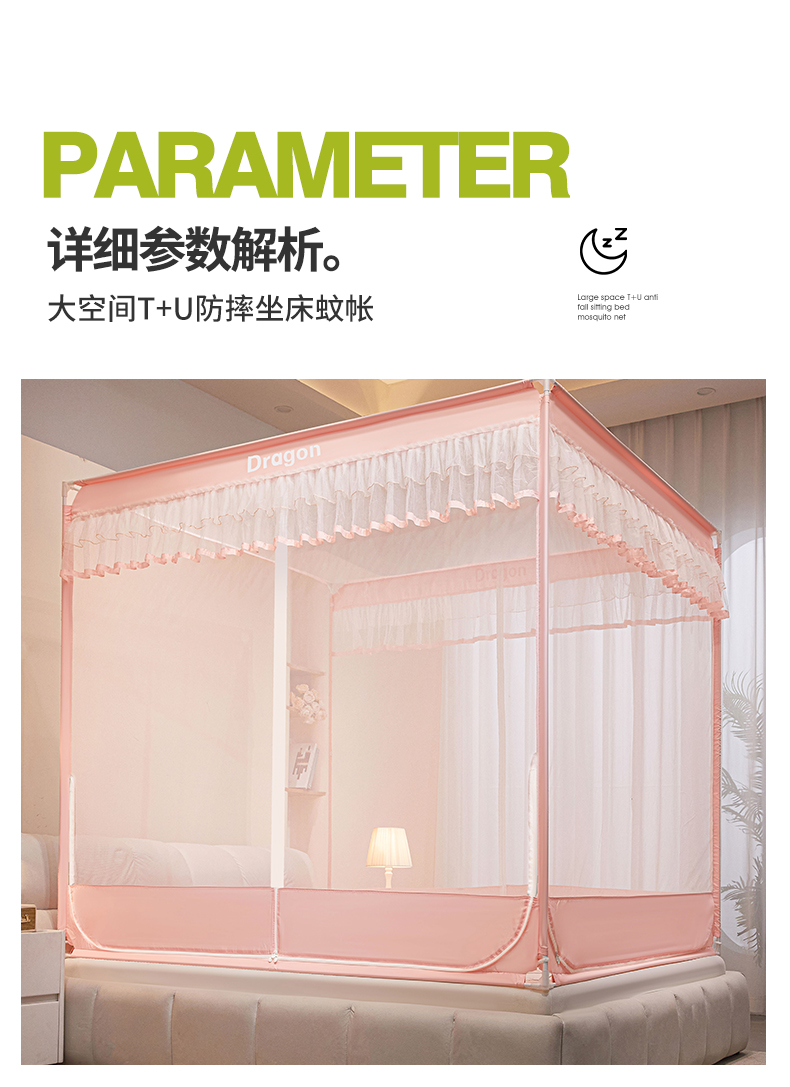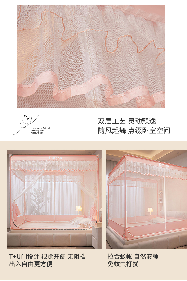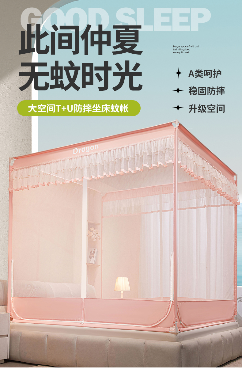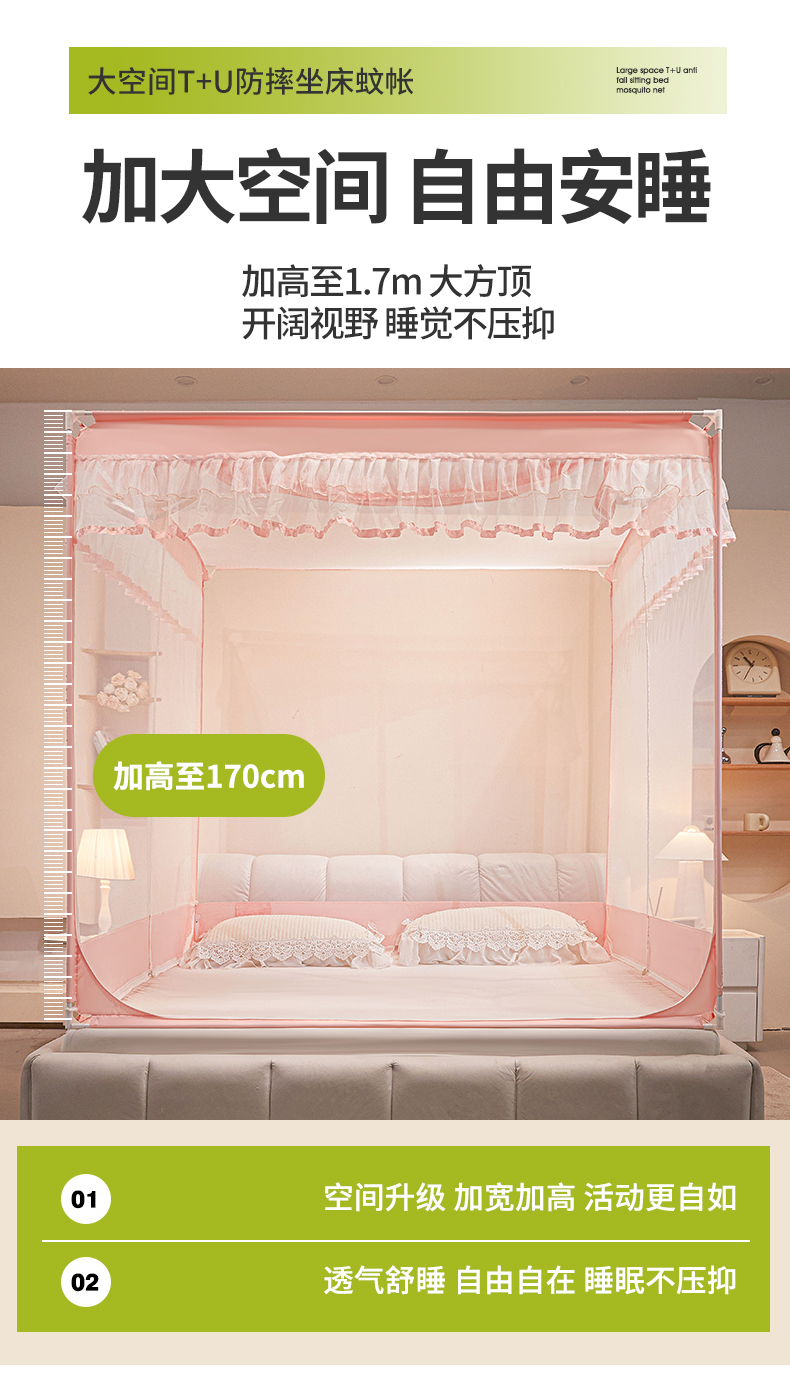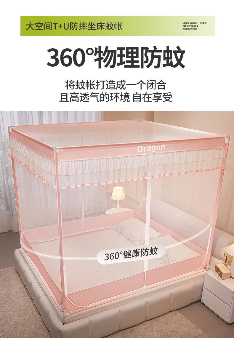 商品名称:梵希良品家纺 2026新款全底家用卧室坐床加密加厚支架全包围加粗大空间T+U防摔坐床蚊帐-漫语 漫语 柔粉