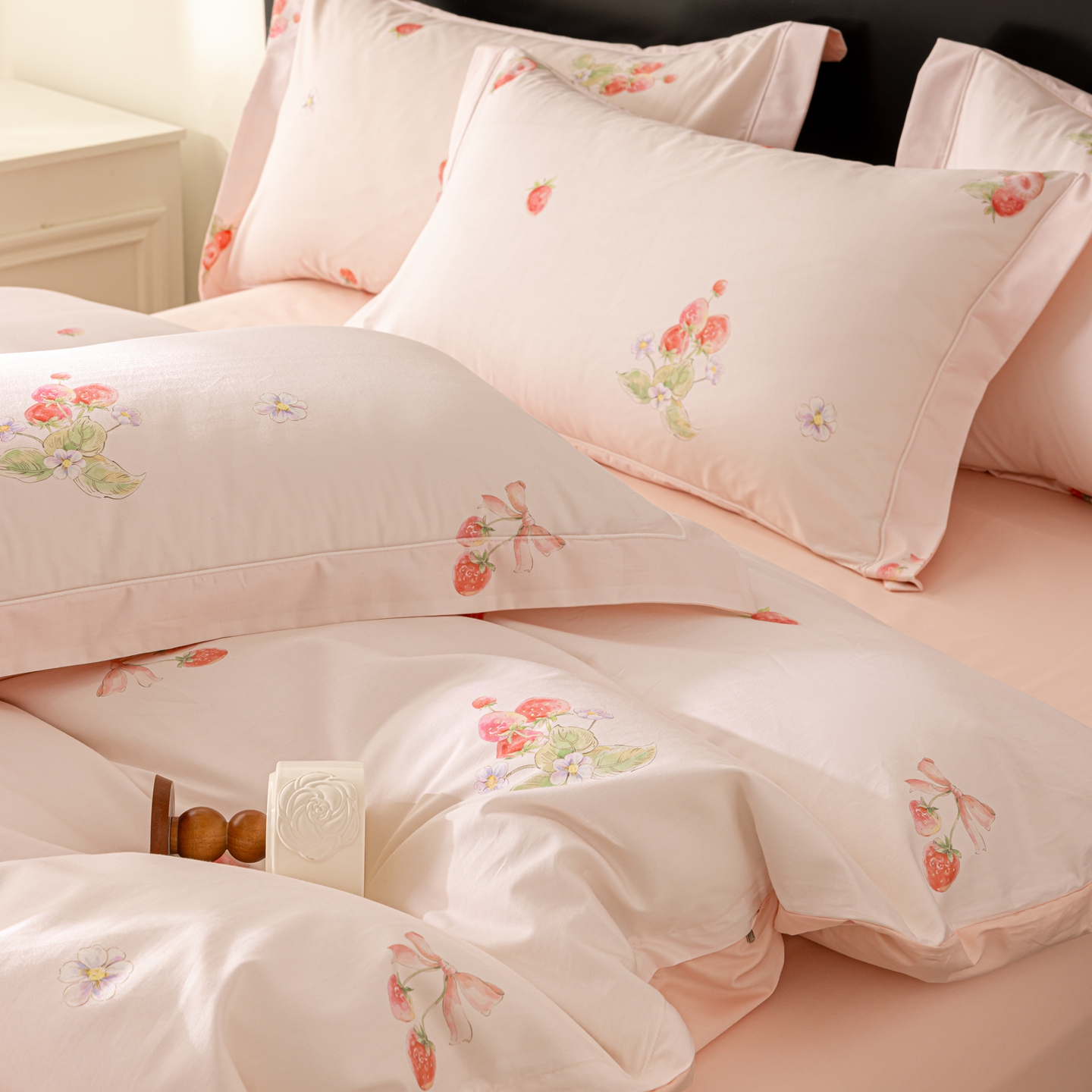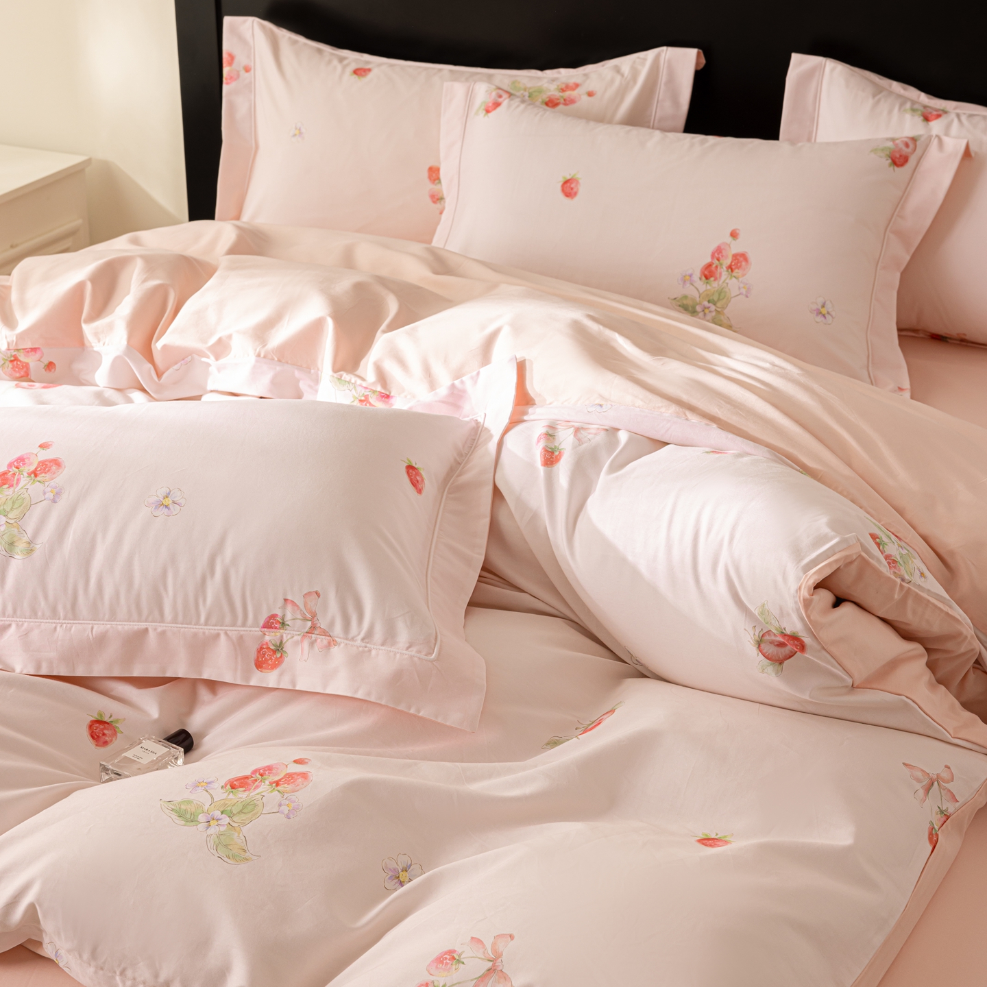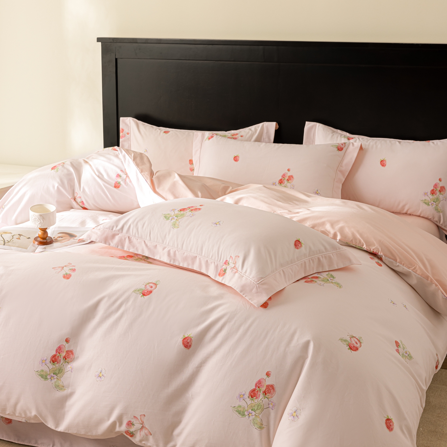 商品名称:莱豫家纺 2026新款50s阿克苏长绒棉数码印花四件套 草莓甜心粉