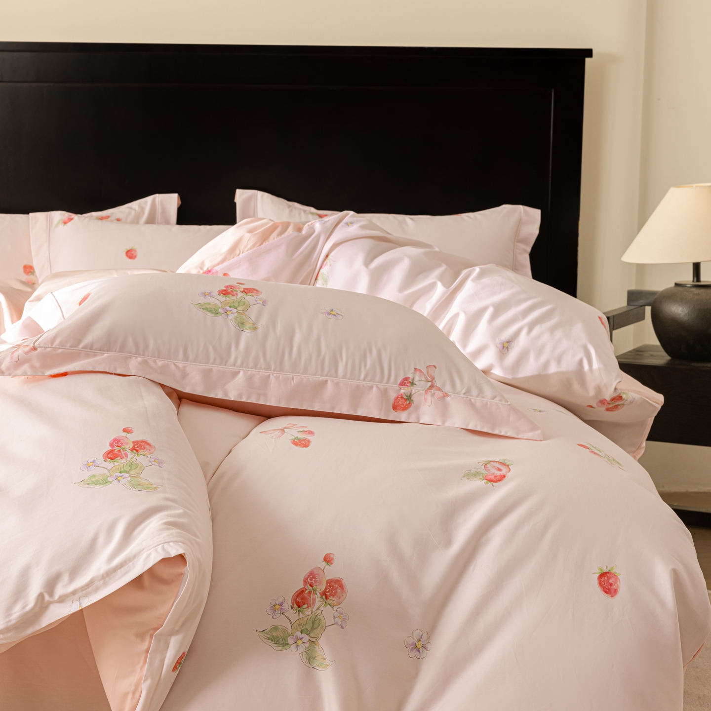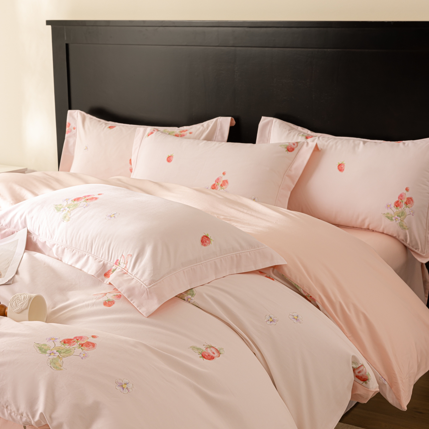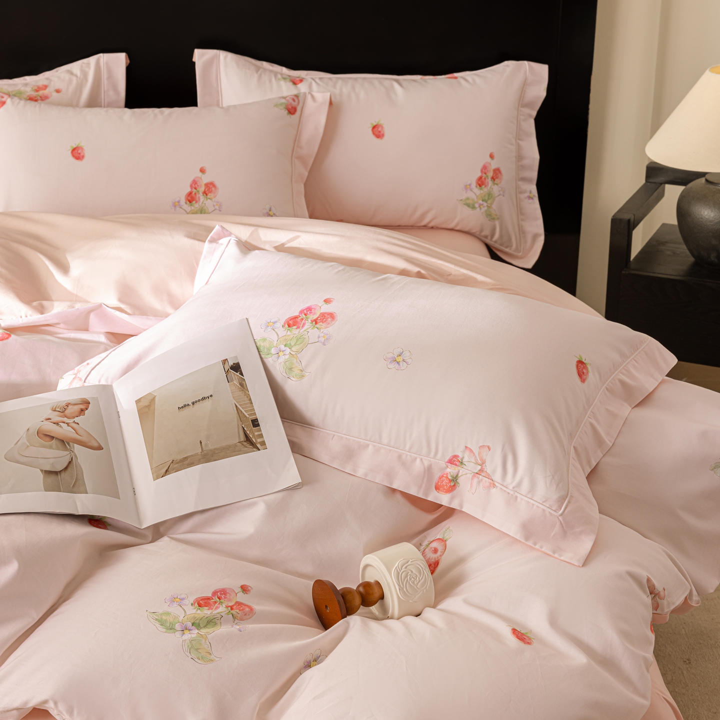 商品名称:莱豫家纺 2026新款50s阿克苏长绒棉数码印花四件套 草莓甜心粉