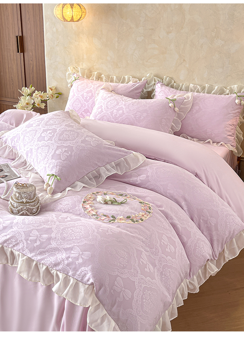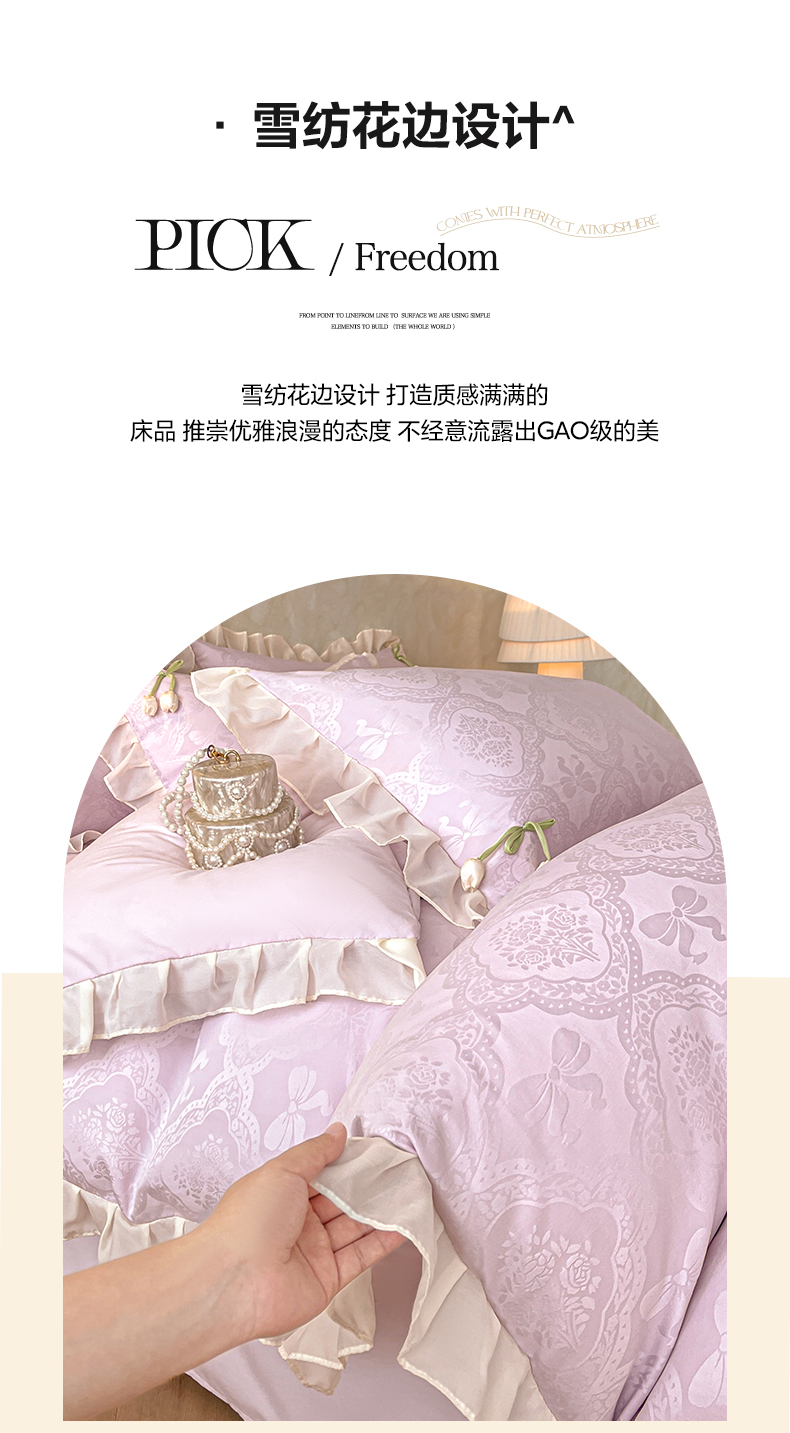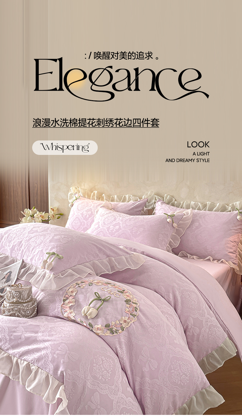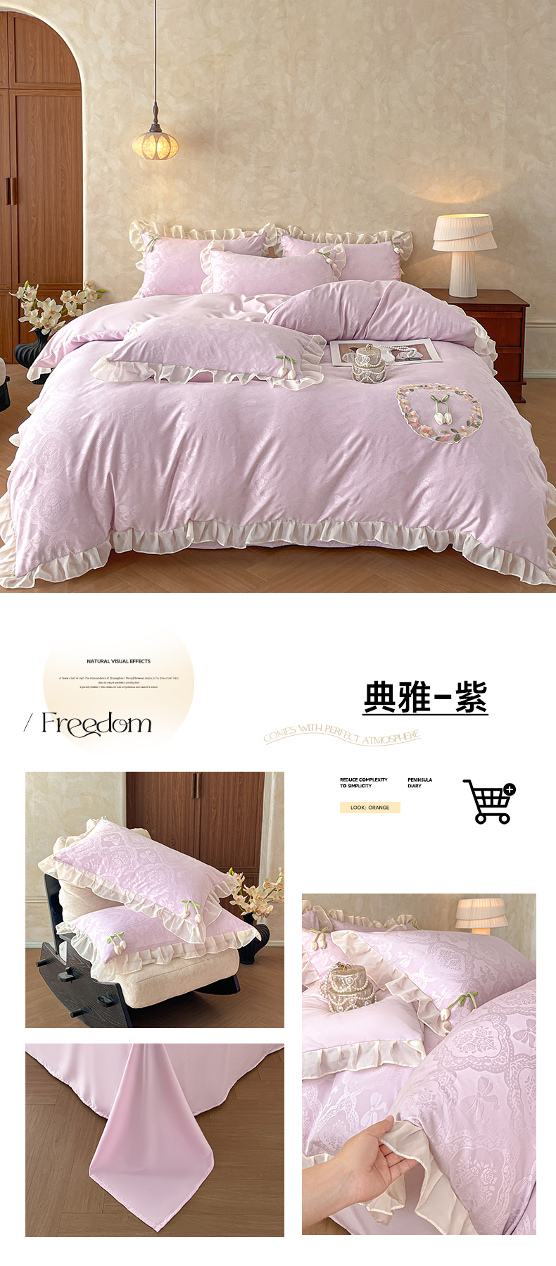 当前位置: 91家纺网 > 商品网购 > 床品套件 > 四件套 > 水洗棉四件套 > 易禾家纺 2026春夏新款提花水冼棉刺绣雪纺花边四件套-典雅 典雅-紫