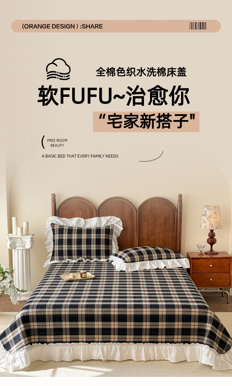 (总)沐辰 2026新款A类色织水洗棉花边款床盖,组合图仅供展示不可下单,橘色中格,洛可可红格,曼特宁-红,曼特宁-绿,小泡芙-兰,小泡芙-紫,英伦格韵