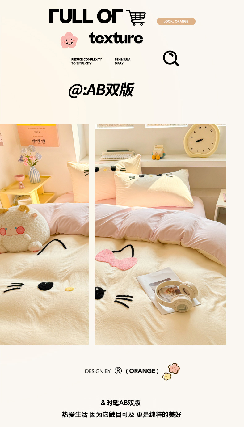 雨帆家纺 2026新款云朵棉卡通毛巾绣四件套 少女甜美猫