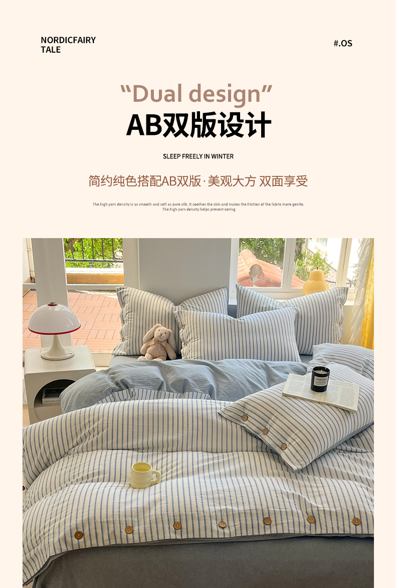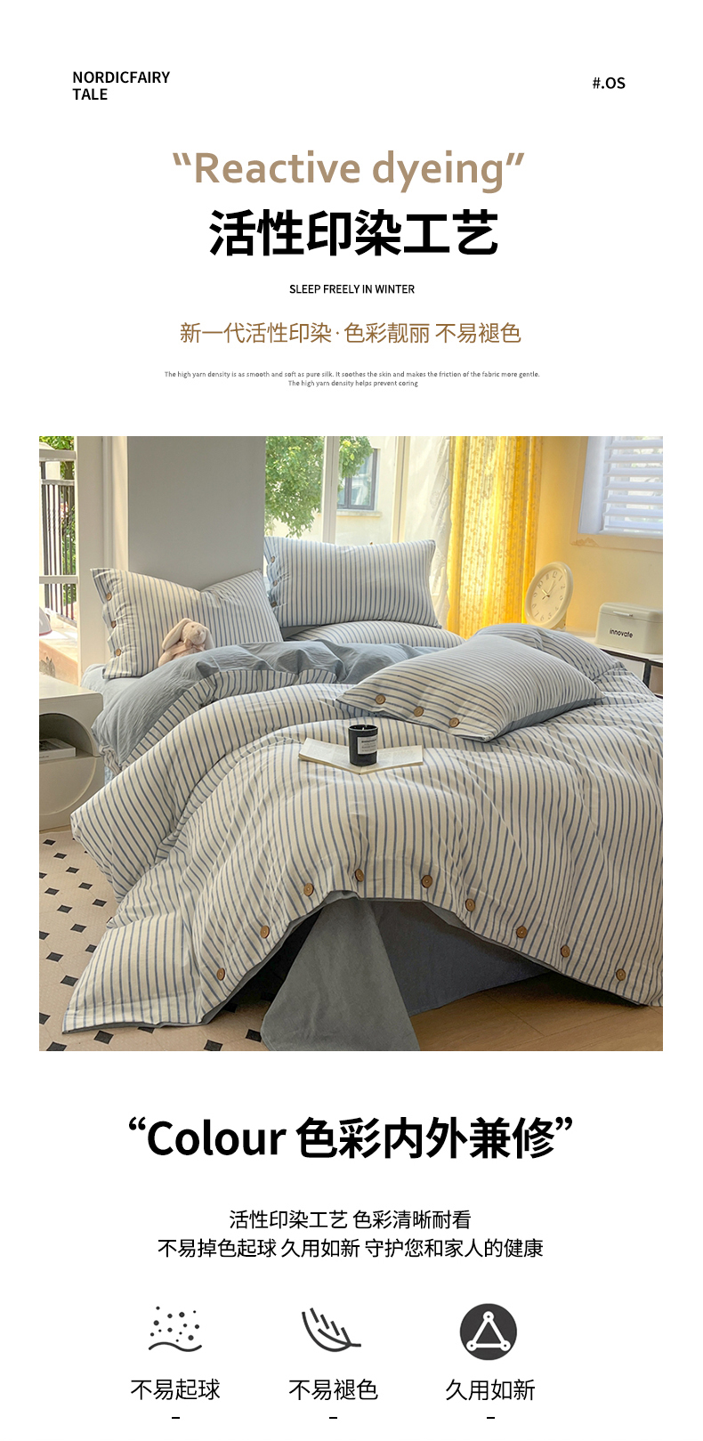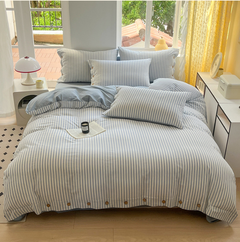 (总)梦依依 2025新款全棉色织水洗棉纽扣款四件套学生三件套全棉纯棉三件套,粉苏条,黑苏条,蓝苏条,绿苏条,米细条,黑细条,灰细条