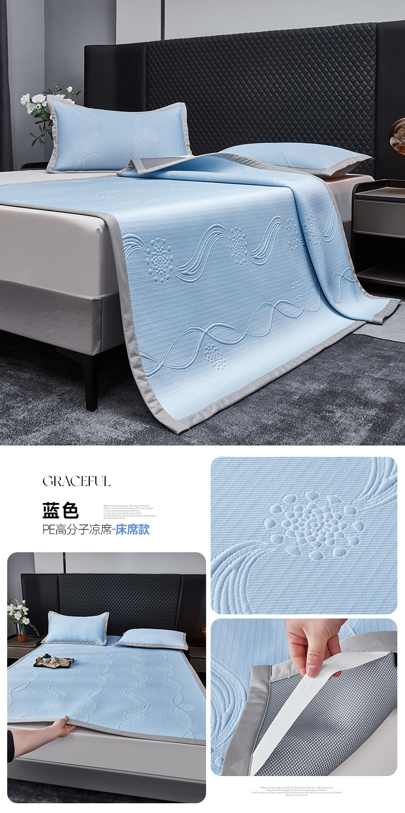 商品名称:库里梦家纺 2026新款轻奢高克重复合PE高分子凉席床笠三件套-芳菲 芳菲-蓝色床席款