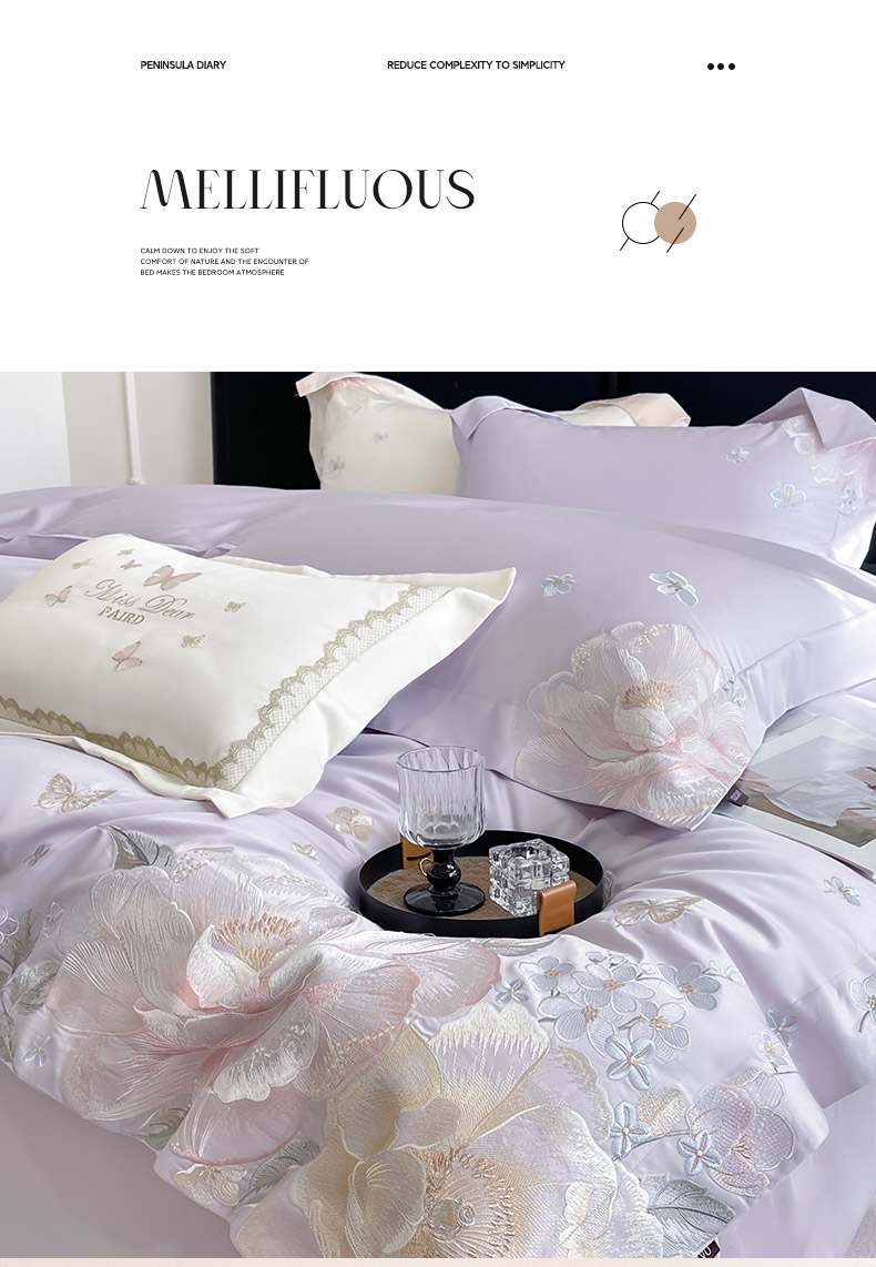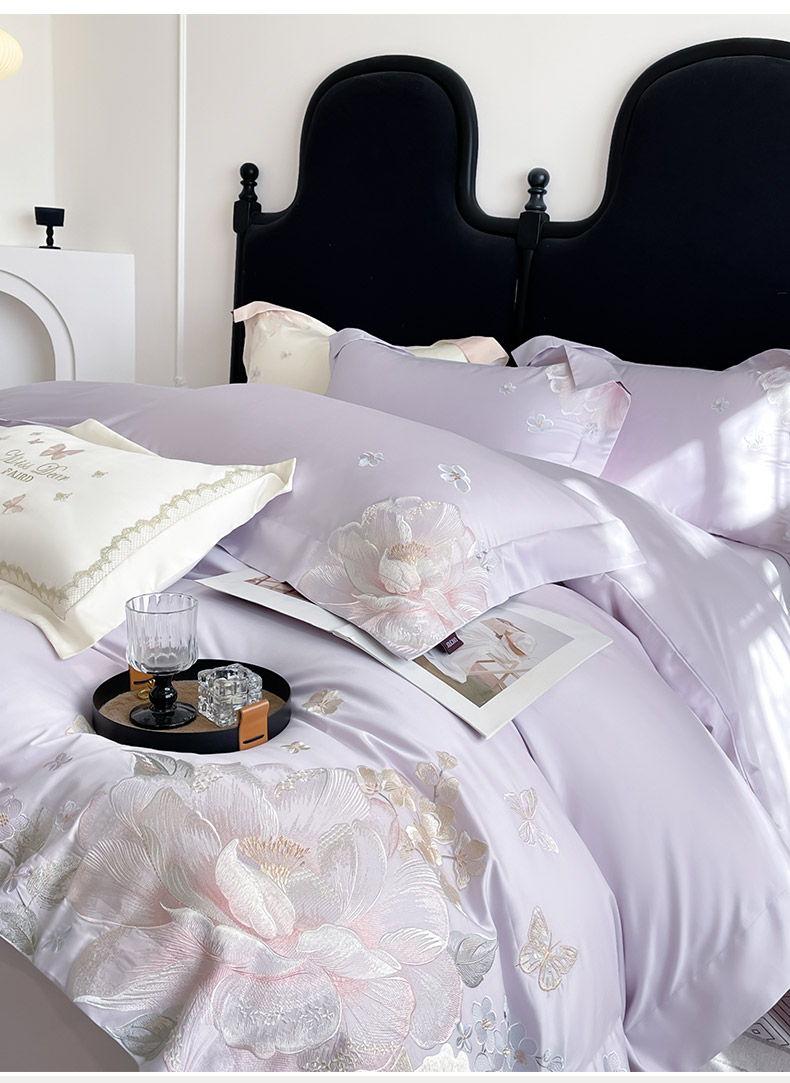商品名称: 2026新品A类100支贡缎长绒棉纯棉四件套全棉重工刺绣全工艺被套床单床笠高端轻奢风床上用品-朵卿 朵卿-黛紫