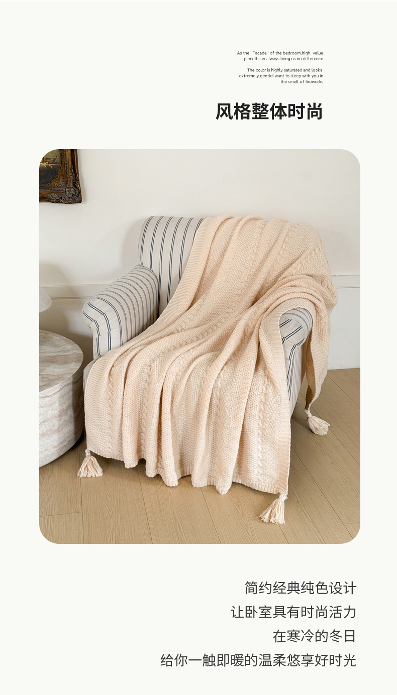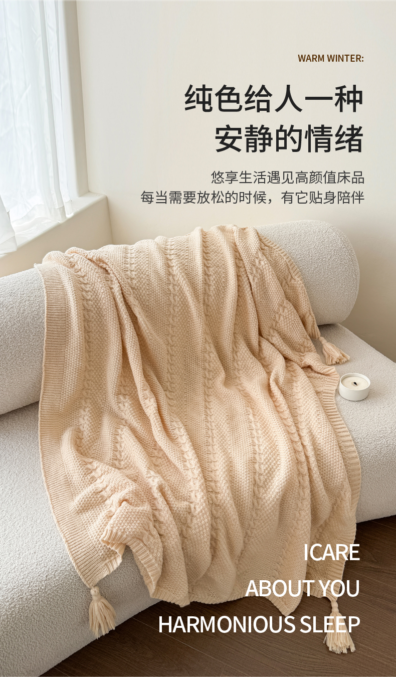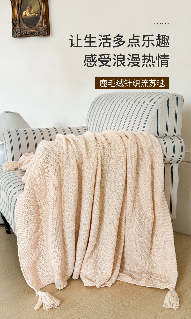 商品名称:丹本家纺 2026新款针织毛毯鹿毛绒纯色流苏航空休闲毯办公午睡盖毯多功能装饰毯 香槟金